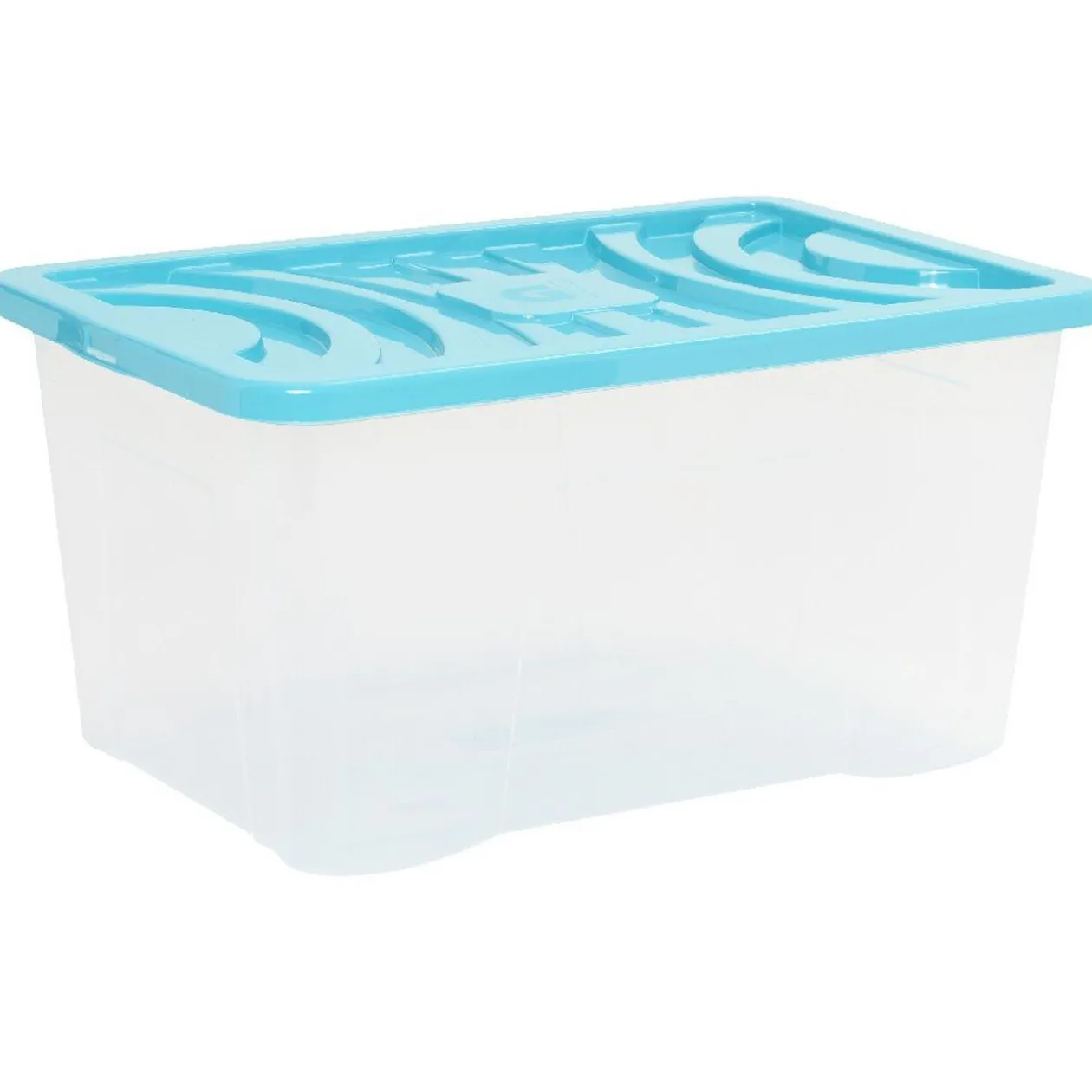 Box de rangement transparent d’une contenance de 60 L, avec couvercle uni bleu ou violet. Disponibilté selon arrivage.