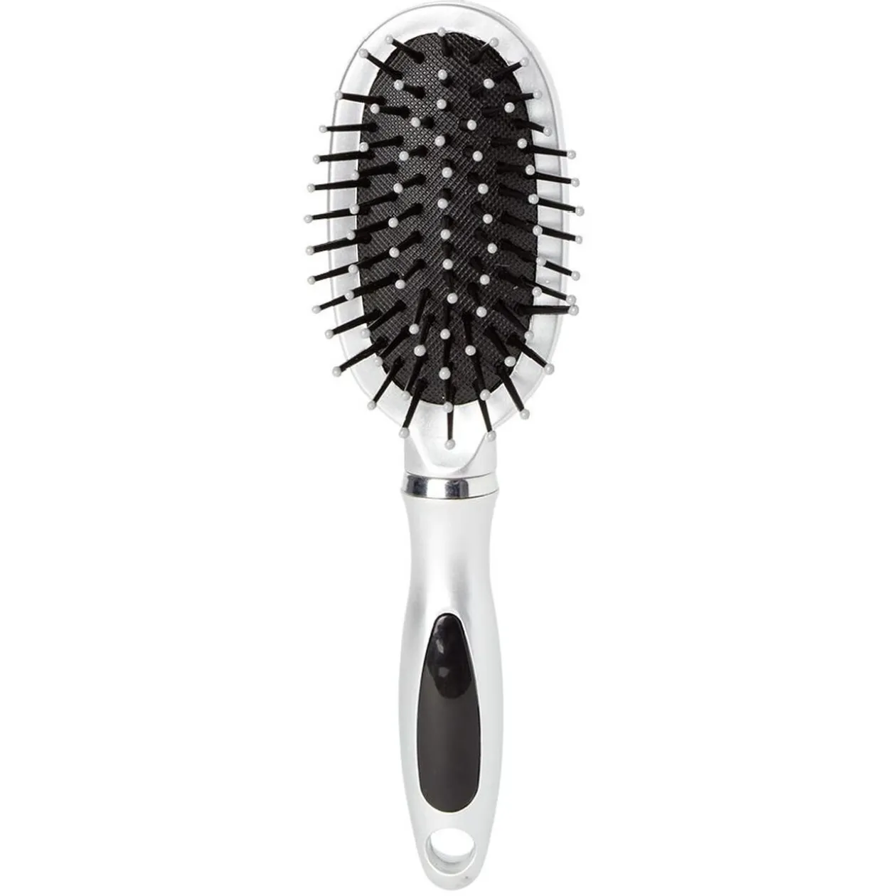 Brosse pneumatique ovale avec picots en pvc noir perlés. Format compact pour sac.
