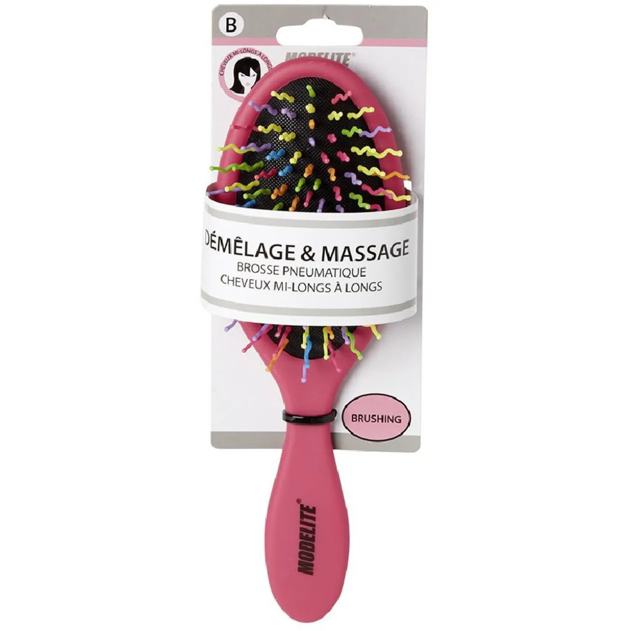 Brosse pneumatique ovale avec picots en pvc multicolore perlés. Idéale pour masser délicatement le cuir chevelu lors du démêlage et du coiffage.