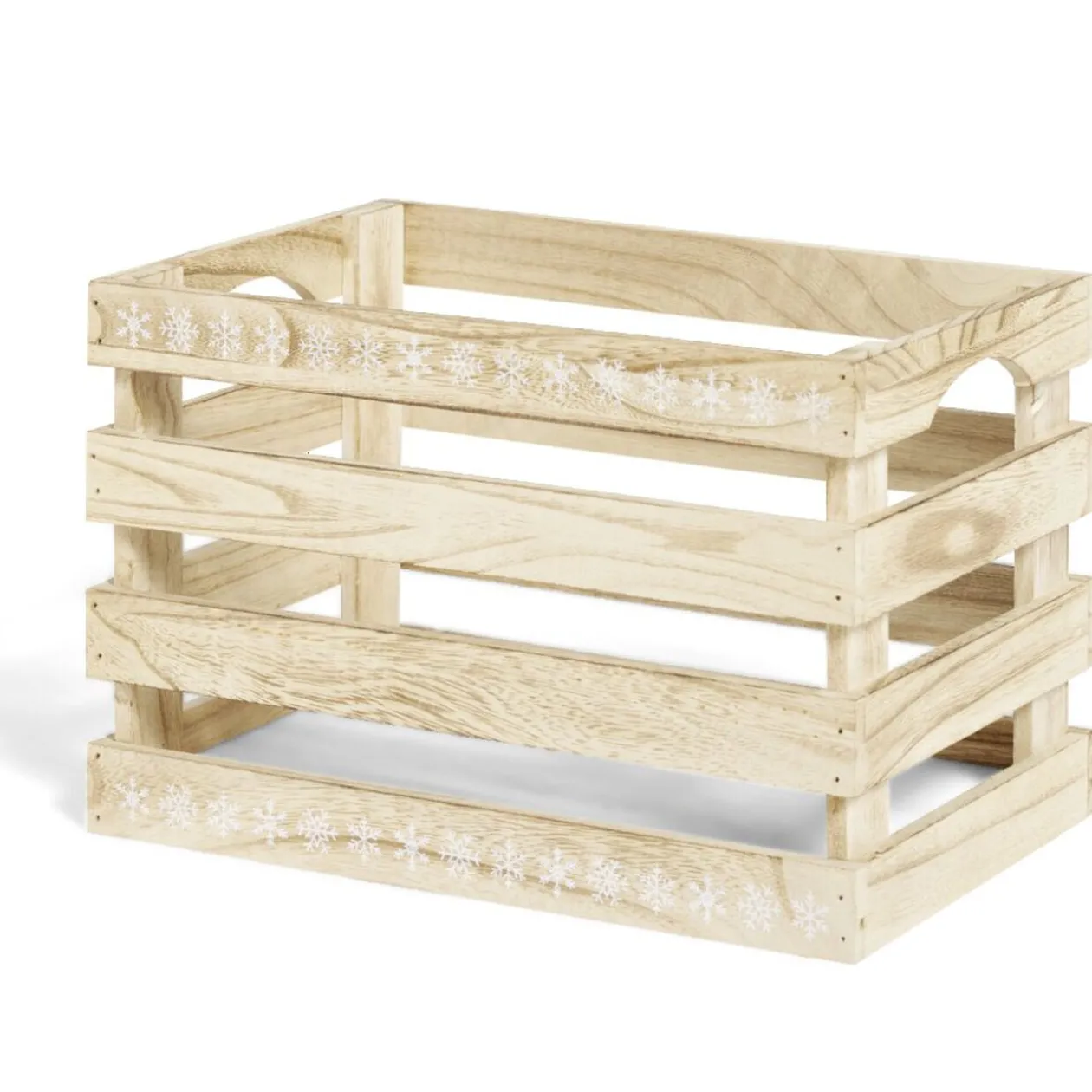 Caisse de rangement en bois à motifs flocons blancs pour la petite touche déco hivernale.