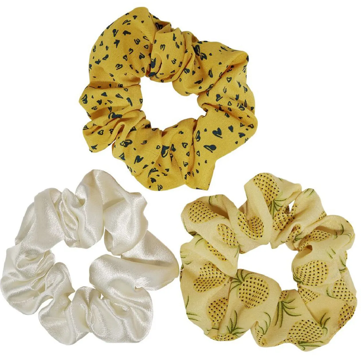 Lot de 3 chouchous dont un couleur ivoire effet satiné, un jaune motifs ananas et un moutarde motifs coeurs, le lot idéal pour varier les fantaisies dans vos coiffures !