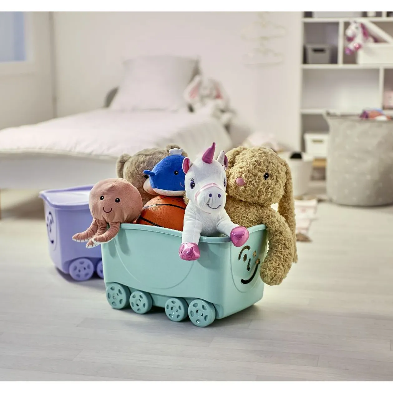 Les enfants pourront optimiser l’espace de leur chambre grâce à ce coffre de rangement couleur lavande ou vert avec motif visage ajouré.