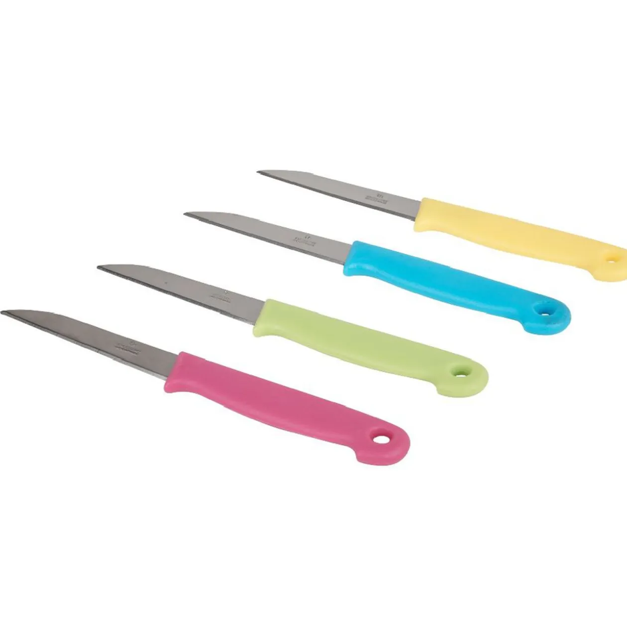 Couteau éplucheur avec manche de couleur rose, vert, bleu et jaune.