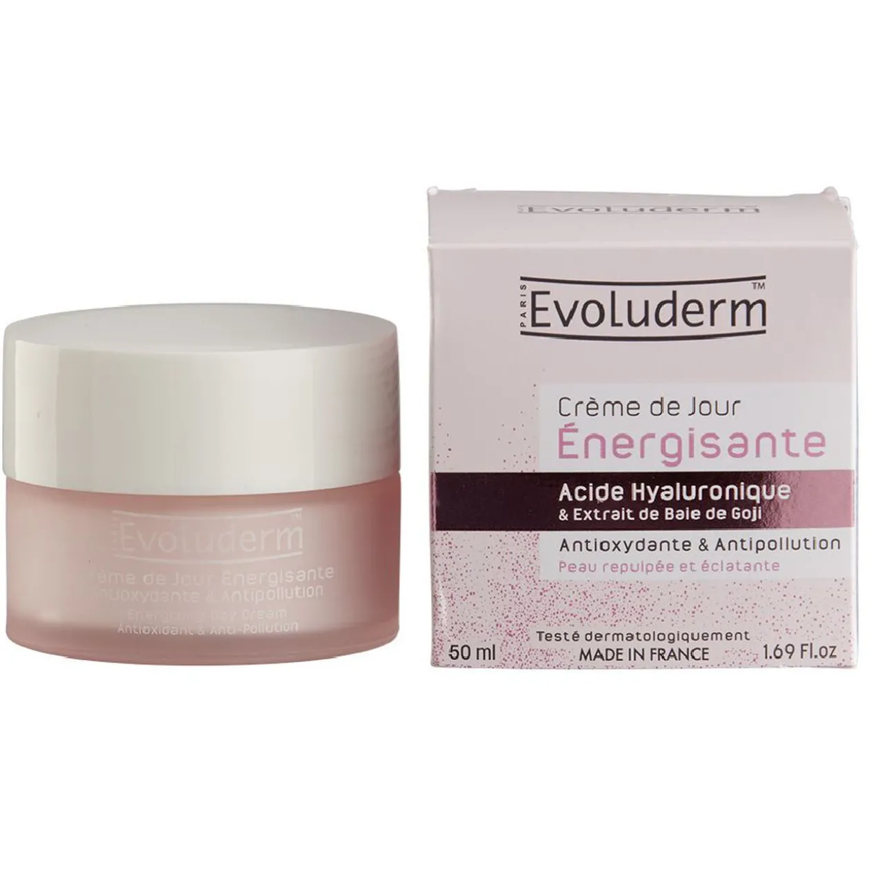 Crème de jour énergisante Evoluderm à l’acide Hyaluronique et aux extraits de baie de goji.Antioxydant et anti-poluution, aide à retrouver une peau repulpée et éclatante.