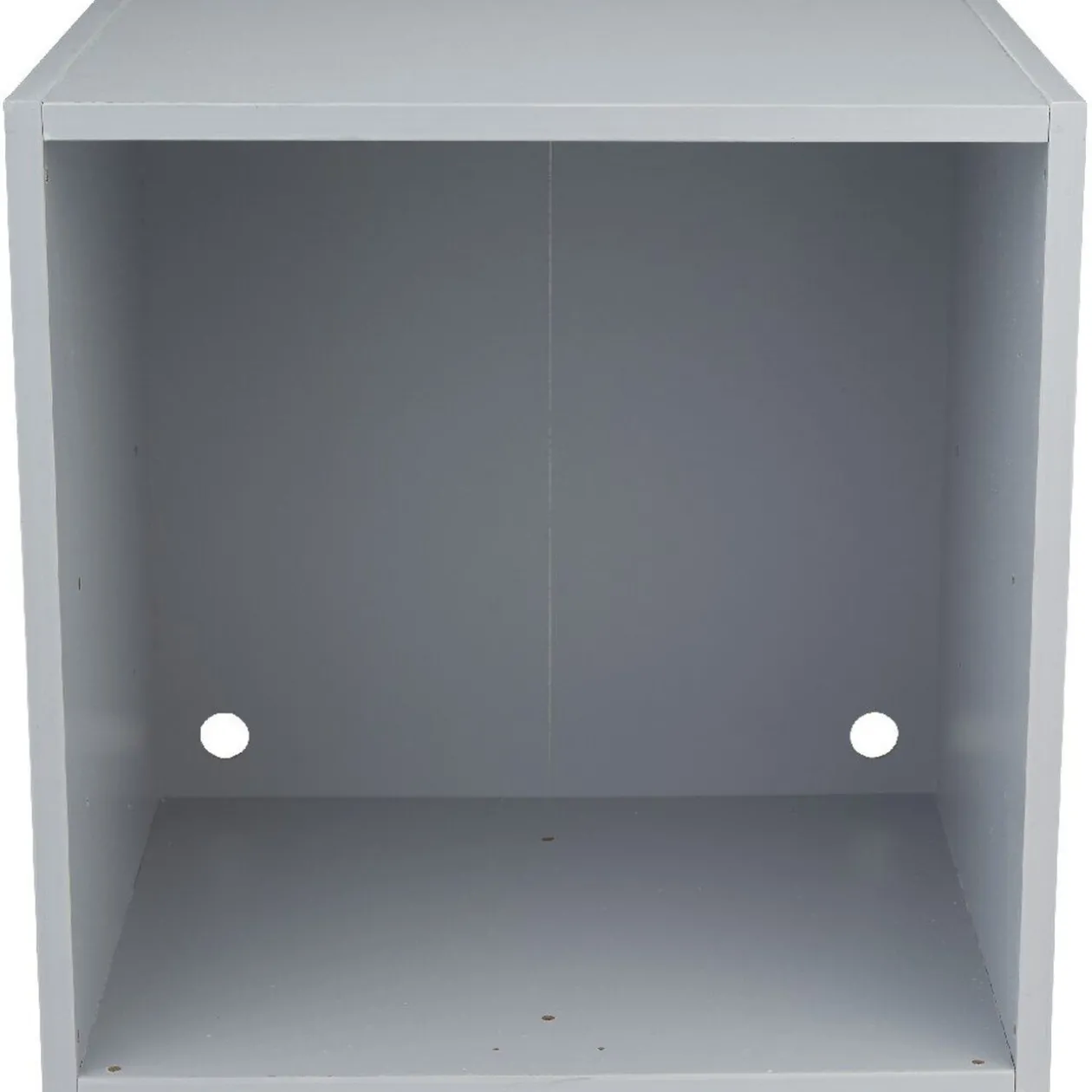 Cube étagère de rangement en panneaux de particules de bois gris.