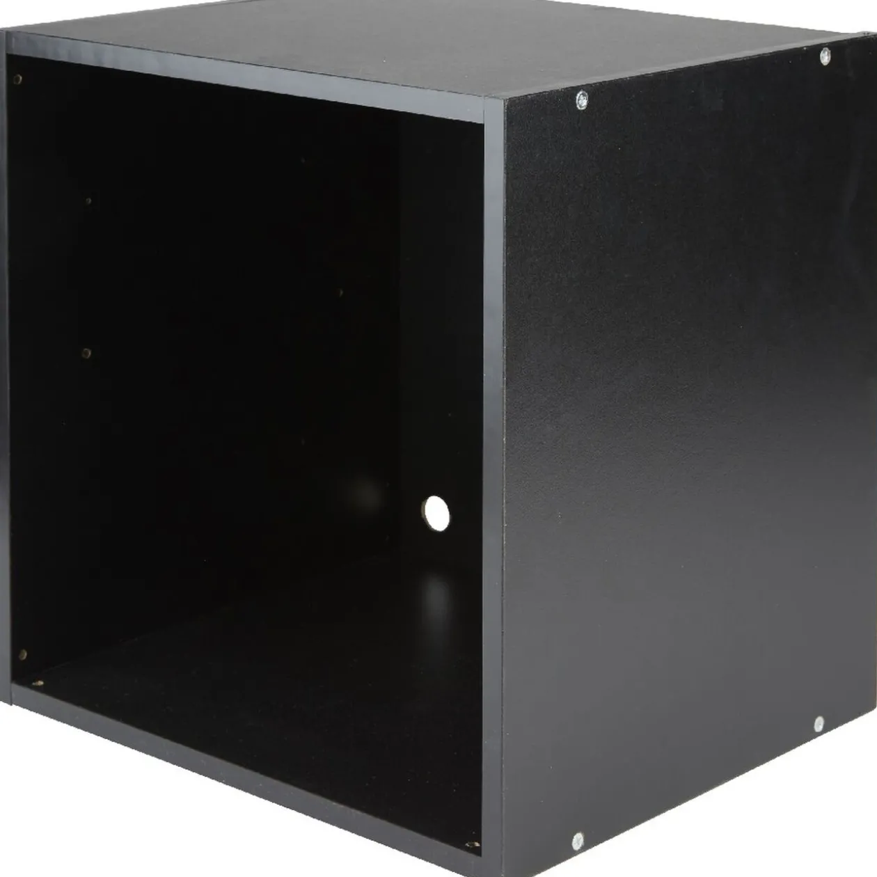 Cube étagère de rangement en panneaux de particules de bois noir.