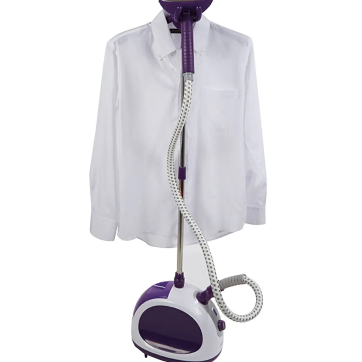 Défroisseur vapeur Homday, puissance 1750 W, réservoir 1,5 L, vapeur 40 g/min, prêt en 45 s. Dim. 34xh.30×22 cm, plastique. Hauteur ajustable pour rangement facile. Garantie 2 ans..