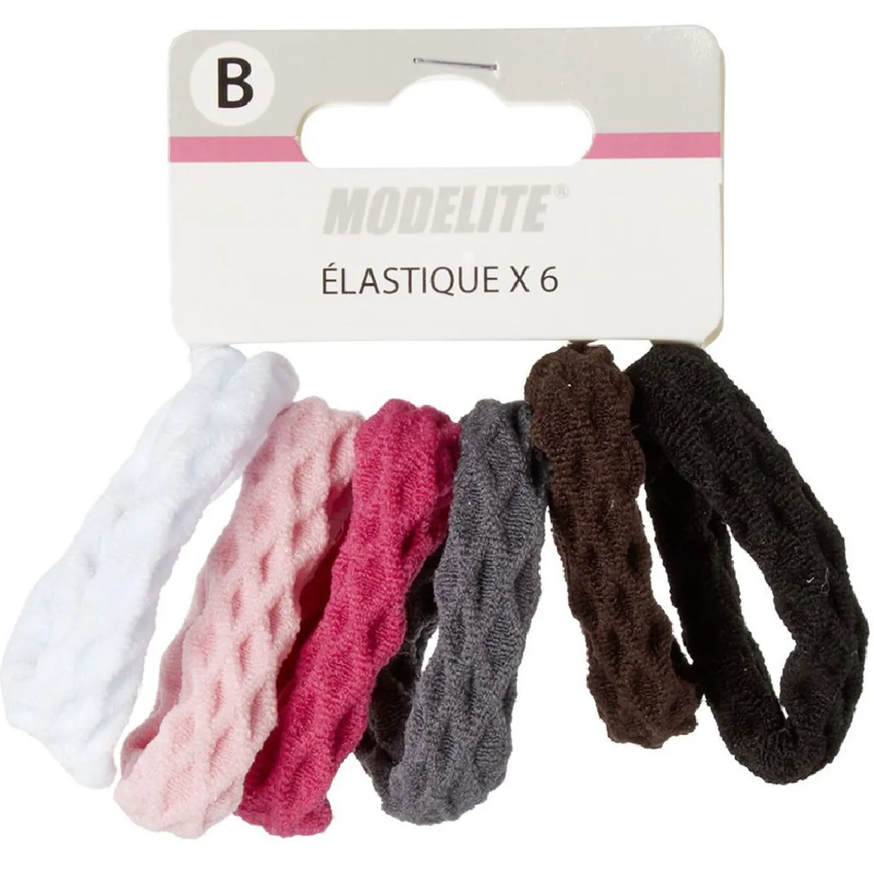Lot de 6 élastiques en mousse de couleur rose, blanc, noir, gris, marron et fuchsia.