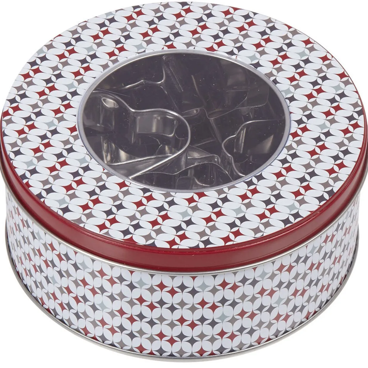10 emportes-pièce en métal L. 5 cm environ, dans boîte en métal dim. Ø13,5xh.6 cm.