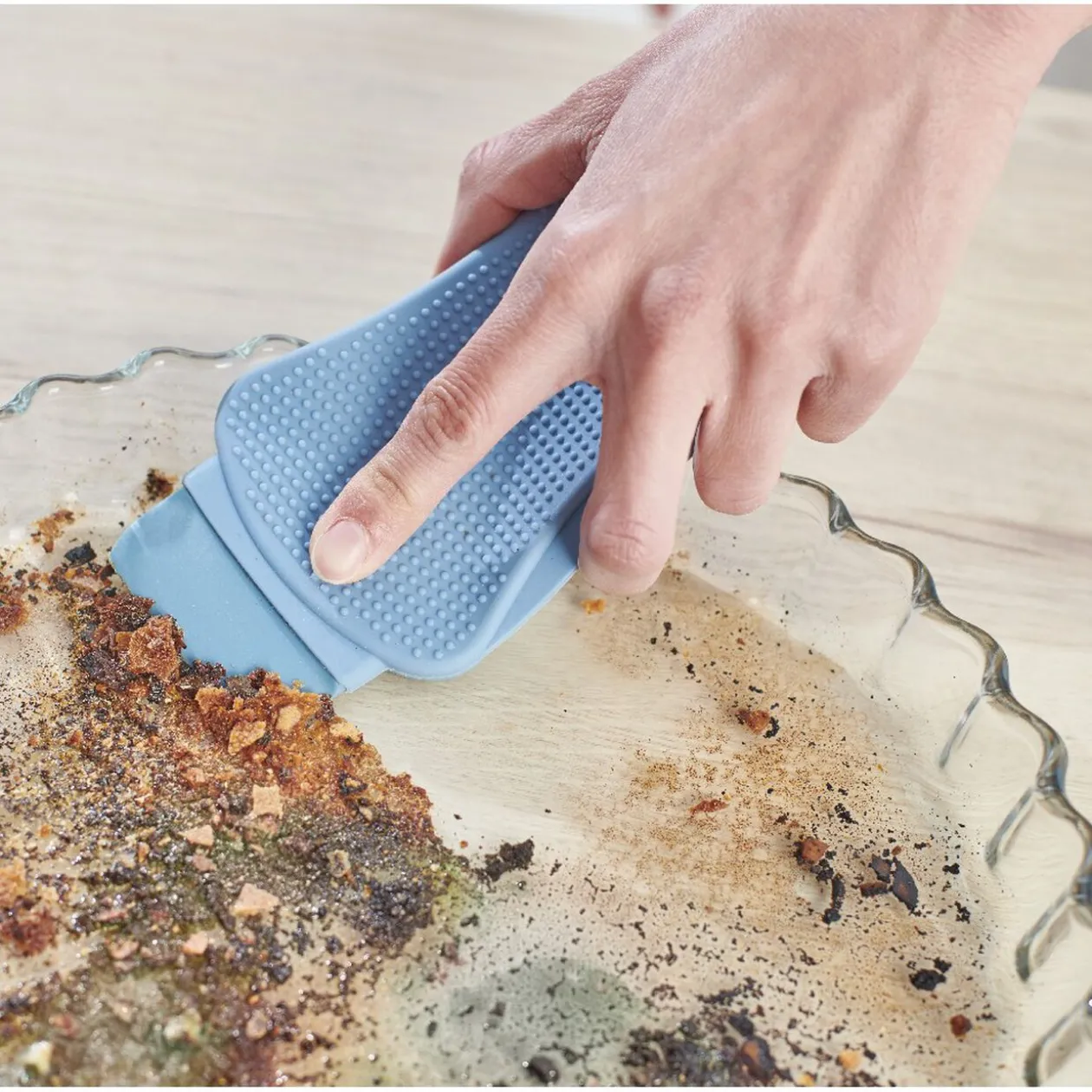 Pour laver : composée de filaments en silicone longs pour la vaisselle classique et courts pour les surfaces délicates.Pour gratter : un grattoir rigide en nylon est intégré.Pour racler : raclette latérale. Se nettoie sous l’eau claire.