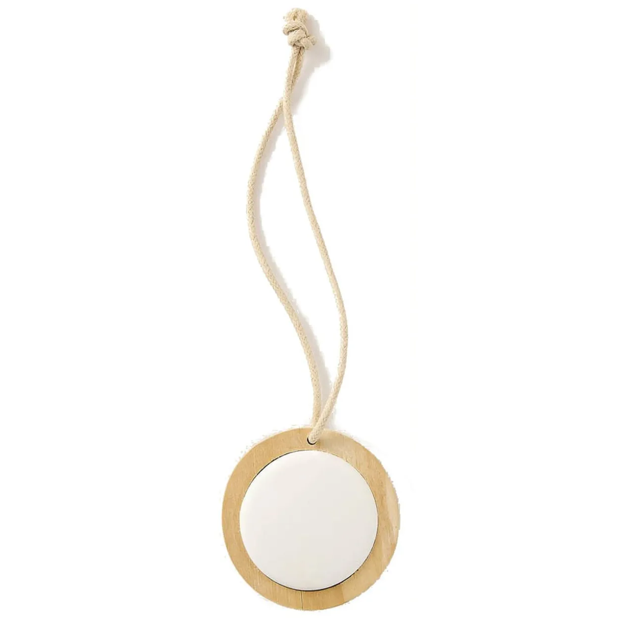 Mettez quelques gouttes d’huiles essentielles sur la partie céramique de ce galet Mességué avec contour en bois, et suspendez-le où vous le souhaitez : poignée de porte, armoire, voiture, etc. Dimensions : Ø 4 x H 9 cm