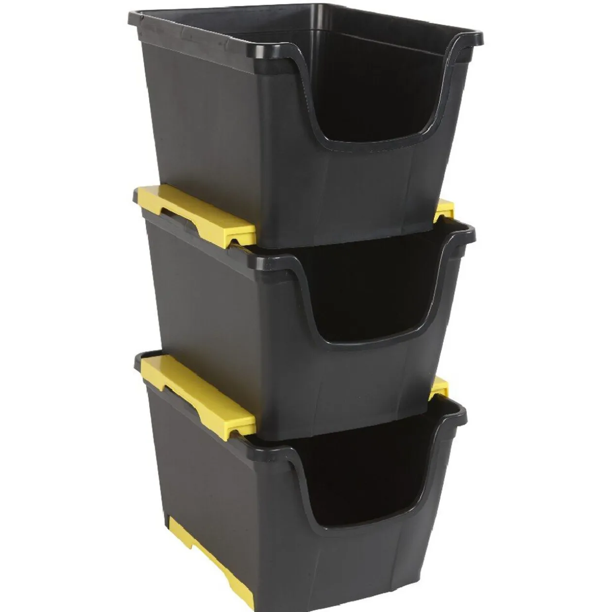 3 gerbettes empilables 14L de couleur noir et jaune, dim. 23,5×31,5xh.19 cm, polypropylène.