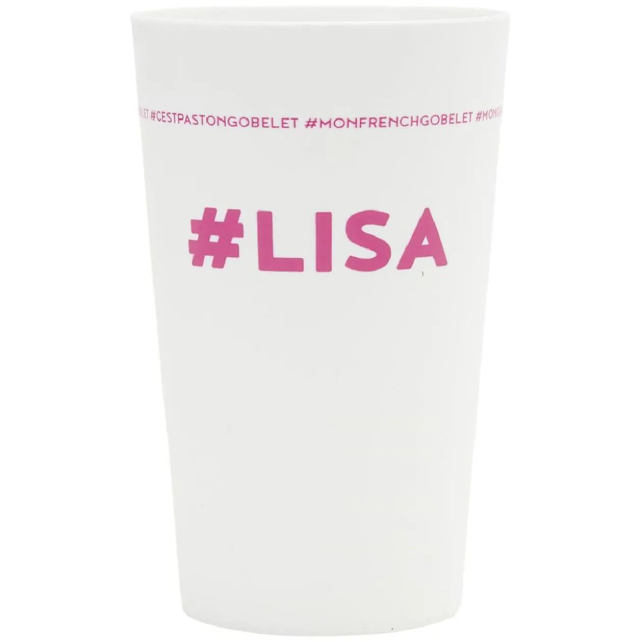 Gobelet réutilisable en plastique blanc avec inscription rose #LISA.