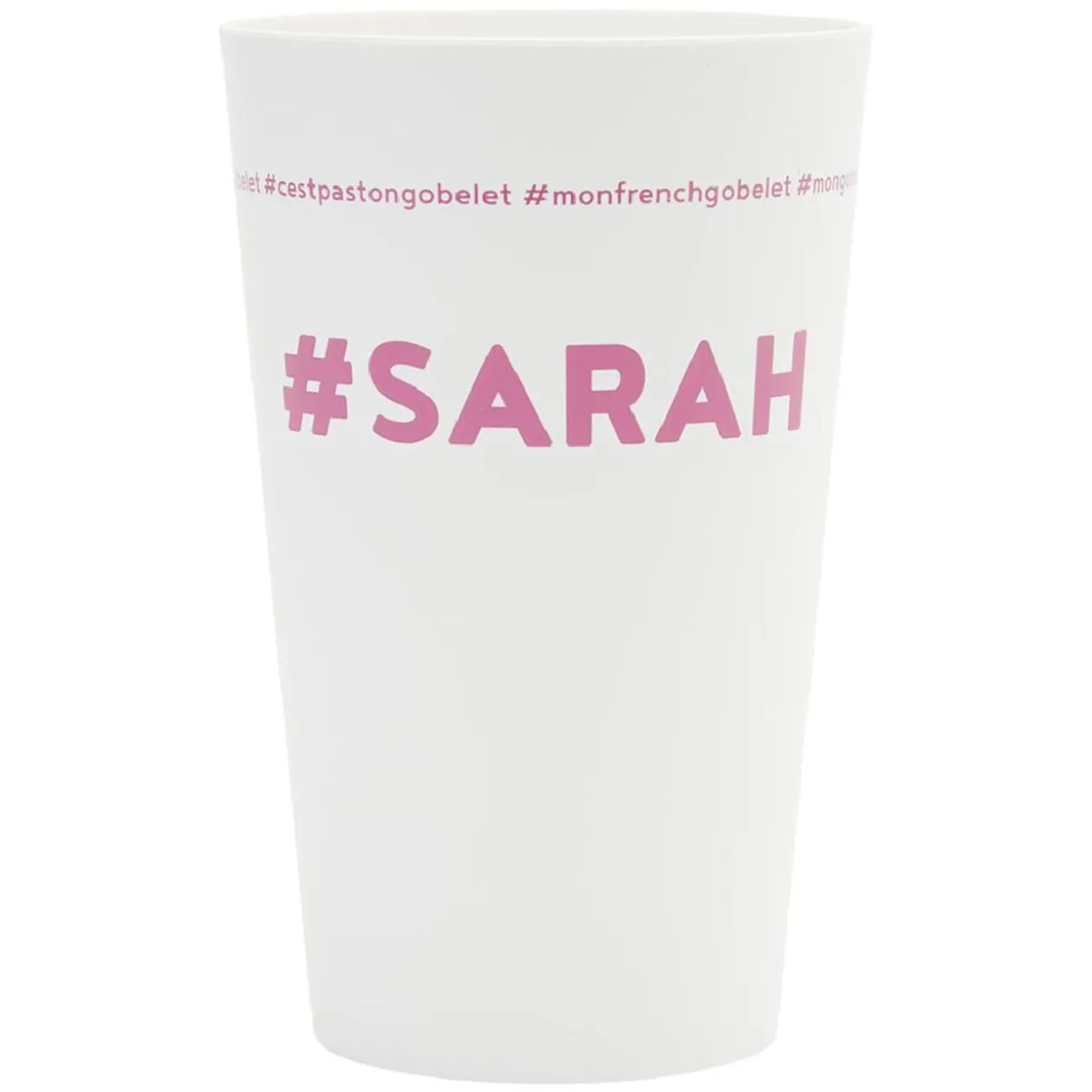 Gobelet réutilisable en plastique blanc avec inscription rose #SARAH.