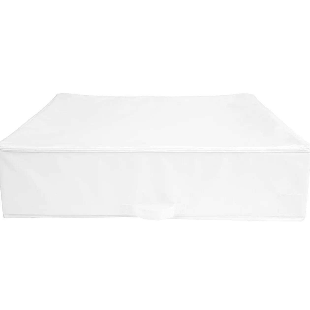 Housse de rangement rigide en tissu synthétique blanc, parfait pour y entreposer vos couettes et couvertures l’été !