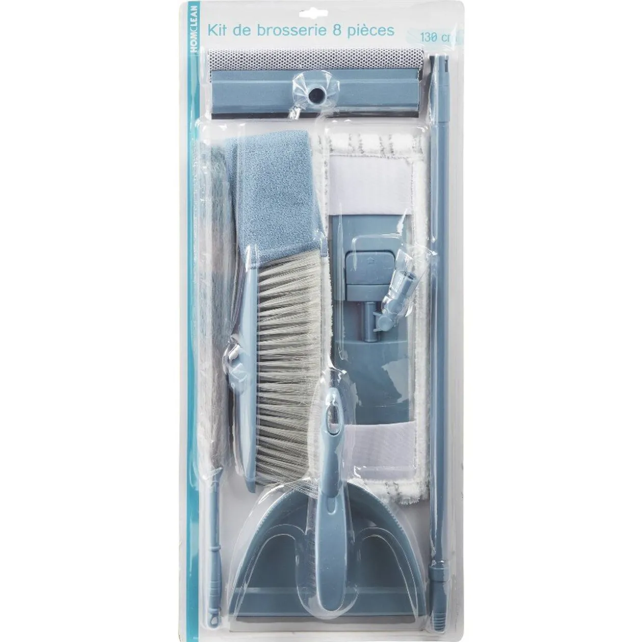 Ce kit est composé d’un manche extensible L. 67 à 120 cm, une tête de balai, une tête de serpillère, une raclette, un chiffon microfibre, un plumeau, une pelle et une balayette. – Matière: Polypropylène.