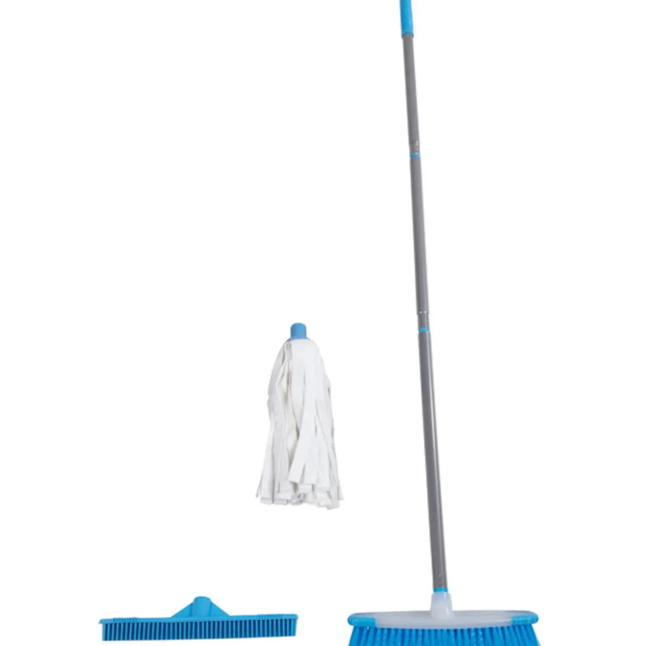 Kit entretien sol comprenant : 1 balai caoutchouc pour moquette, tapis et extérieur, 1 balai espagnol, 1 balai droit, 1 manche L. 125 cm.
