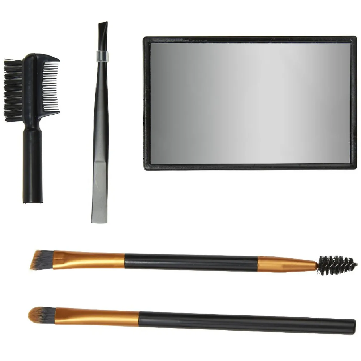 Contient un miroir de poche, un pinceau paupière, un pinceau eyeliner et mascara, une pince à épiler et une brosse à sourcils.