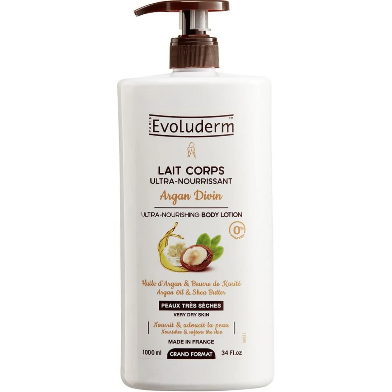 Lait ultra-nourrissant Evoluderm enrichi en huile d’argan et beurre de karité pour prendre soin de sa peau tout en l’enveloppant d’un parfum doux et apaisant.