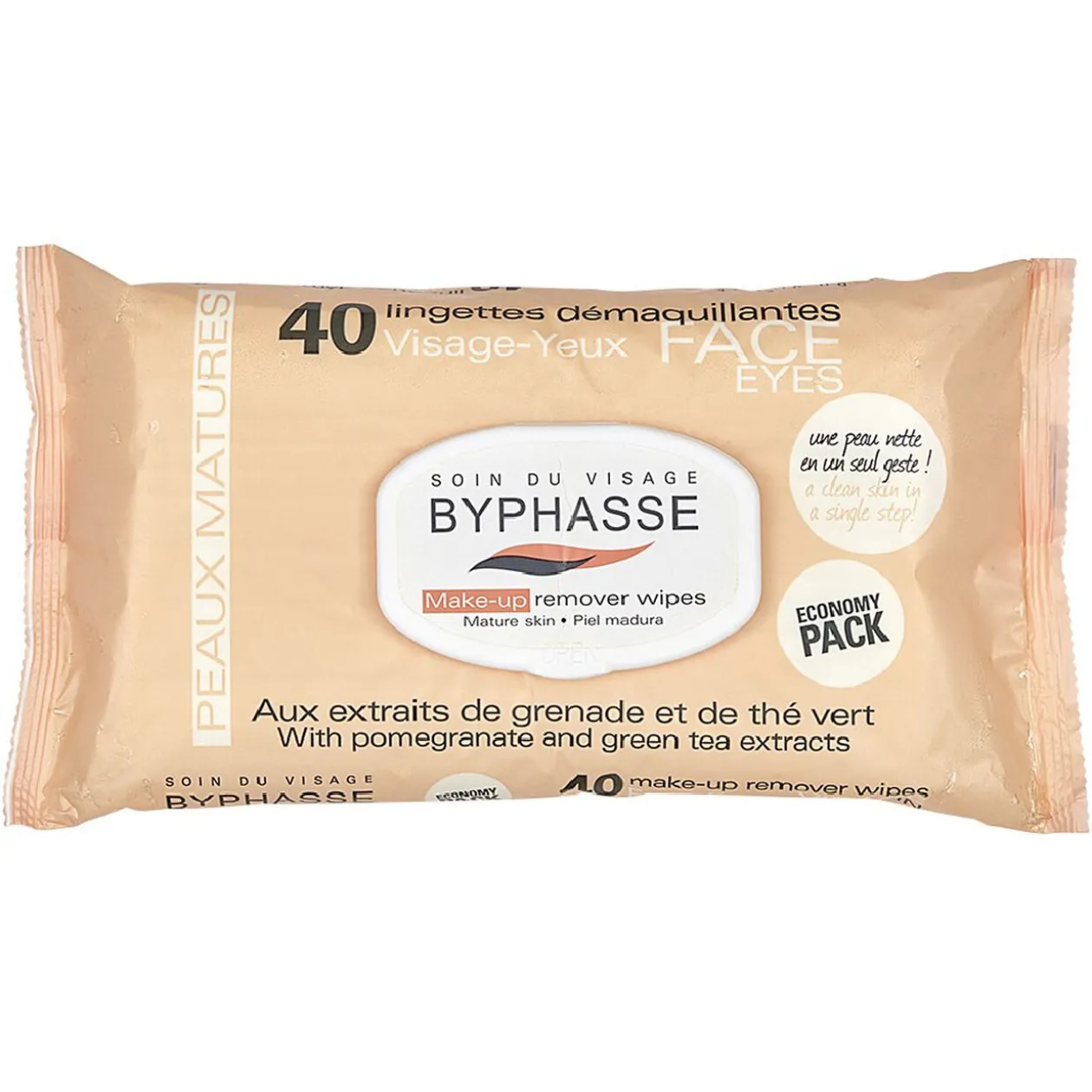 40 Lingettes démaquillantes Byphasse aux extraits de grenade et thé vert pour peaux matures.