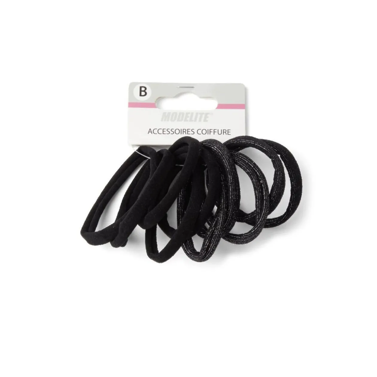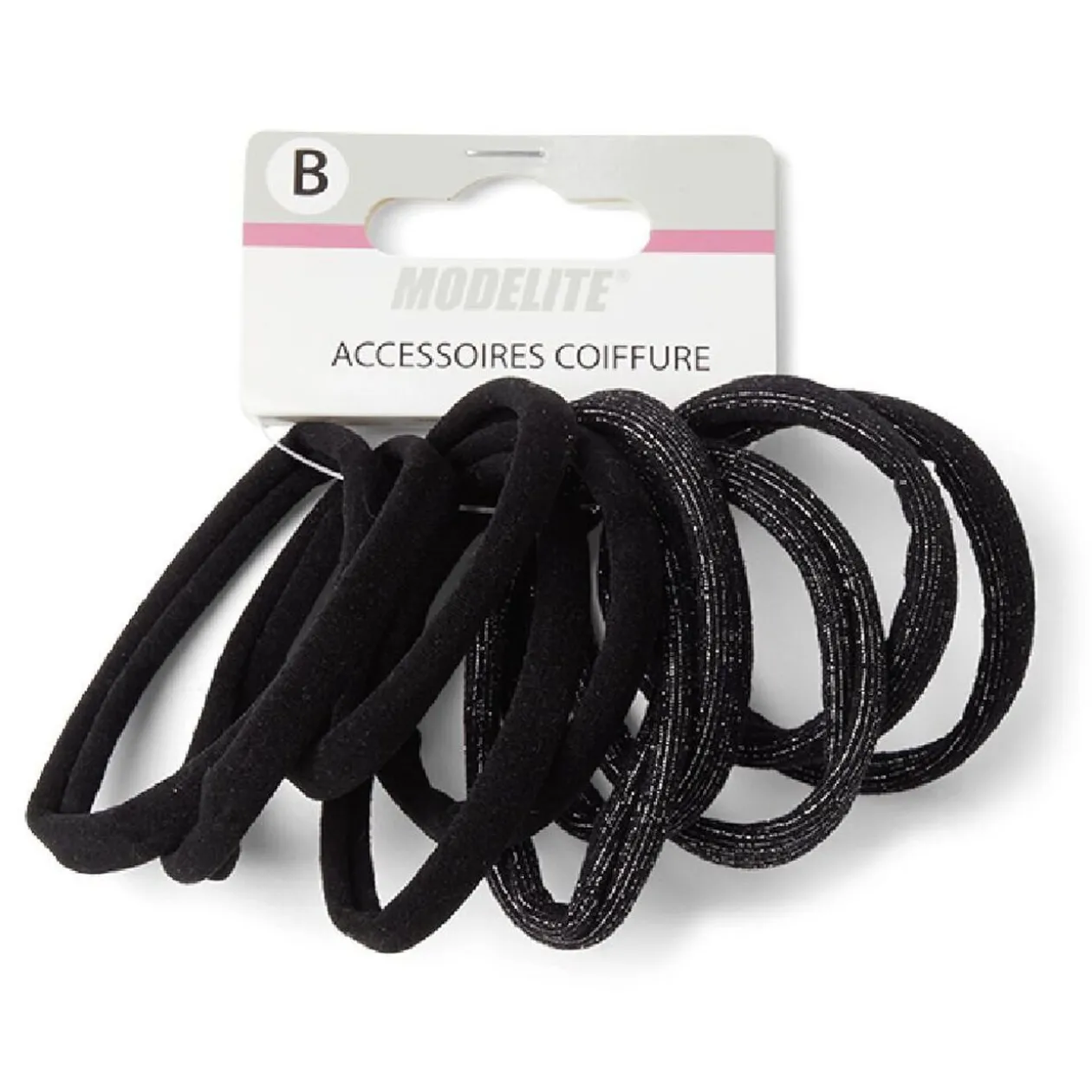 Lot de 10 élastiques à cheveux en polyester noir effet mousse, comprenant 5 élastiques basiques et 5 élastiques ornés d’un fil métallique argenté.