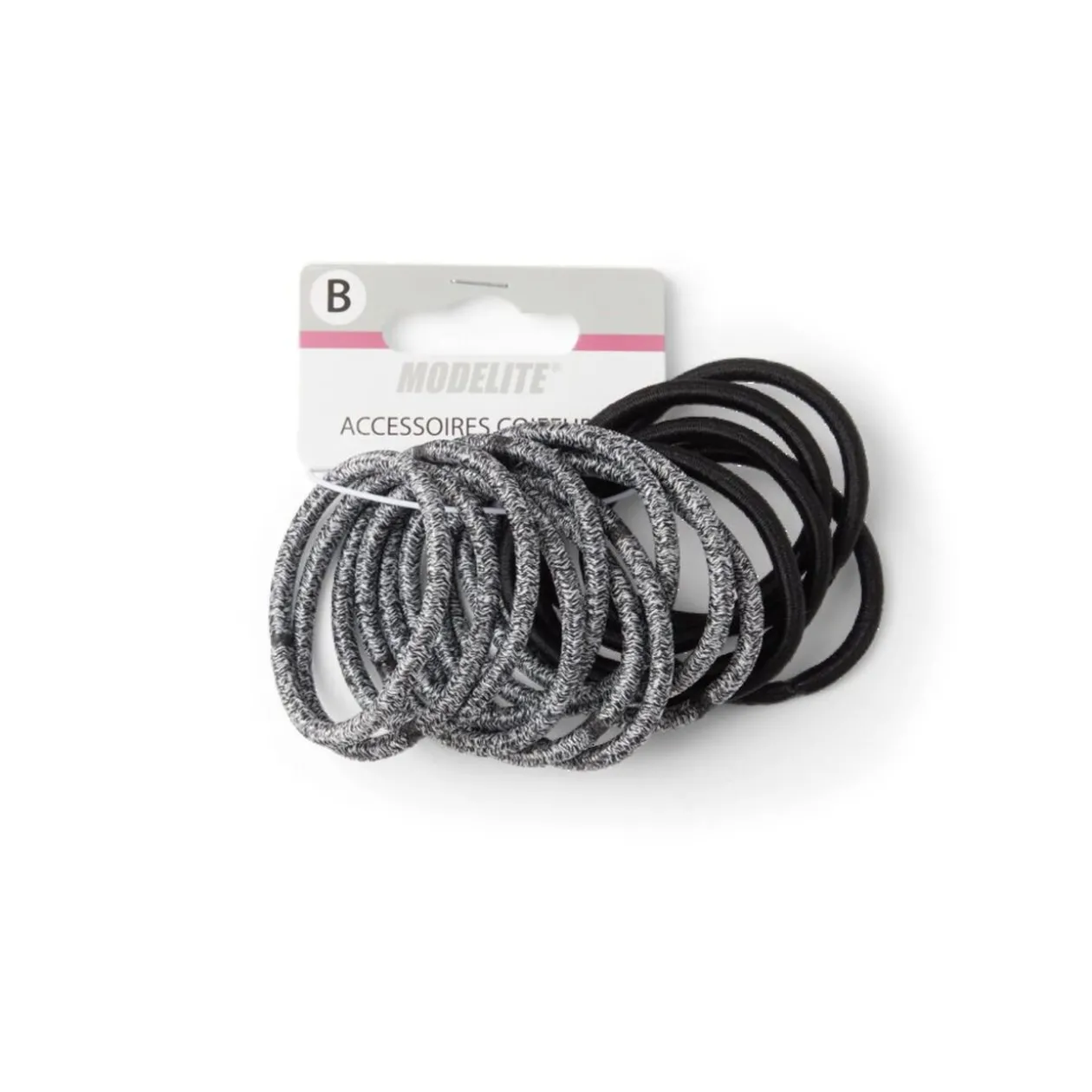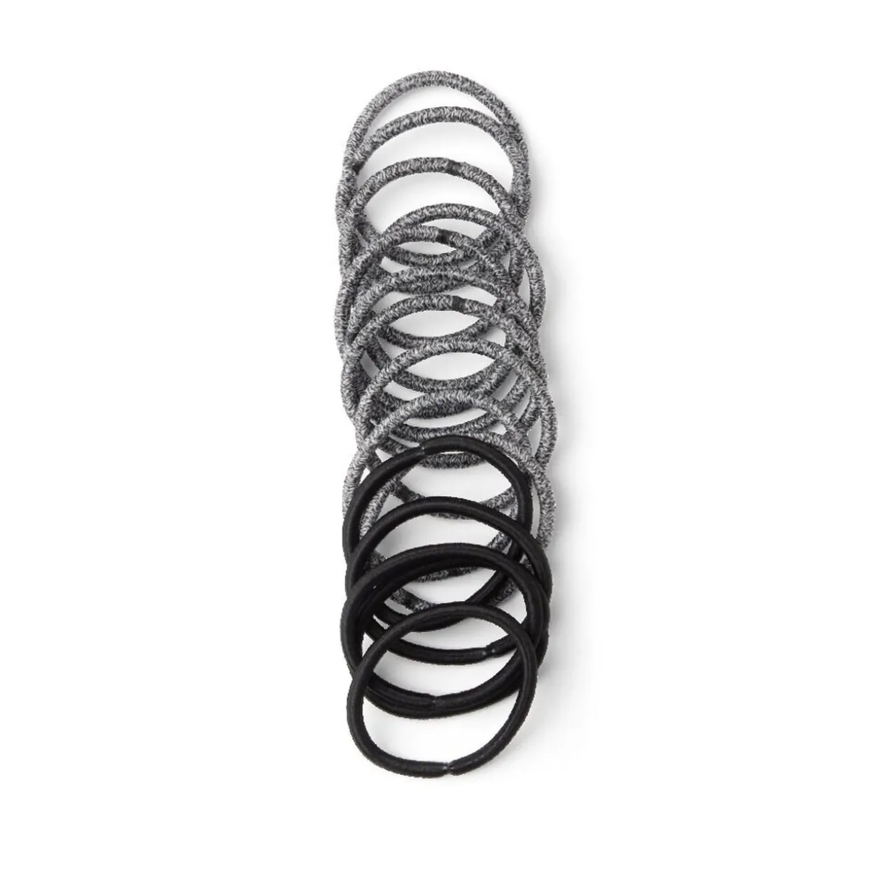 Lot de 15 élastiques à cheveux en polyester, comprenant 5 élastiques noirs classiques et 10 élastiques noir et blanc à l’aspect chiné.