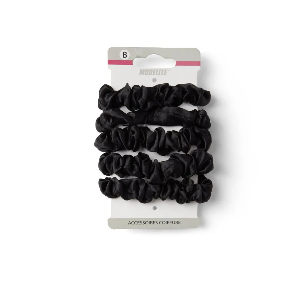 Lot de 5 chouchous scrunchies en polyester satiné noir, un accessoire polyvalent pour coiffer vos cheveux avec style.