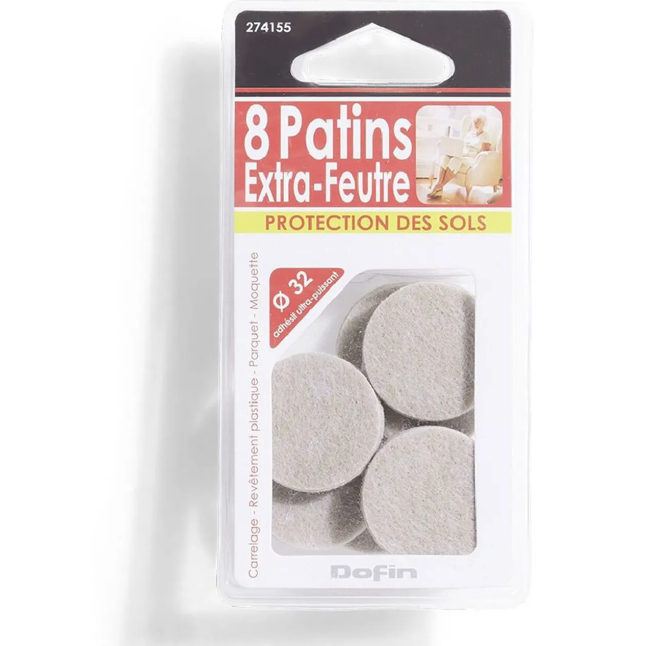 Lot de 8 patins en feutre avec adhésif ultra puissant. Format rond : Ø32 mm.