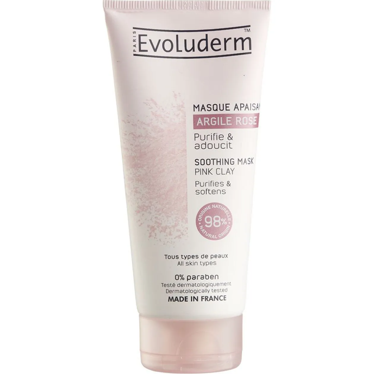 Masque apaisant Evoluderm enrichi à l’argile rose, laisse la peau douce et purifiée.