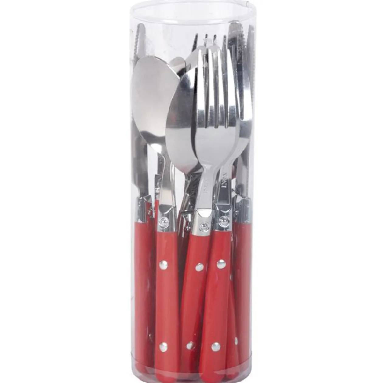 Ménagère composée de 16 pièces en inox avec manche coloré en plastique rouge.