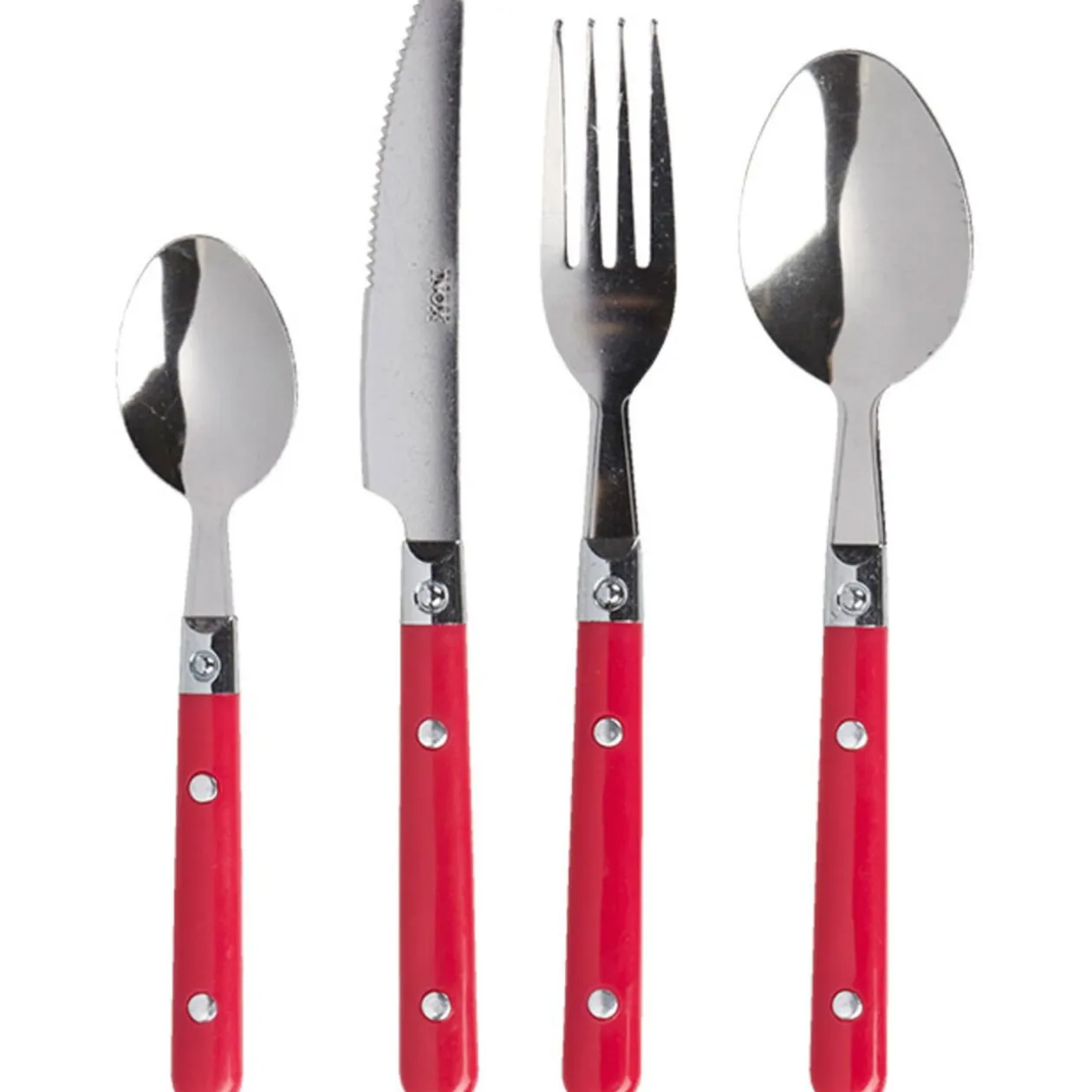 Ménagère 16 pièces rouge comprenant 4 fourchettes, 4 cuillères à soupe, 4 couteaux et 4 cuillères à café, inox, manche plastique.