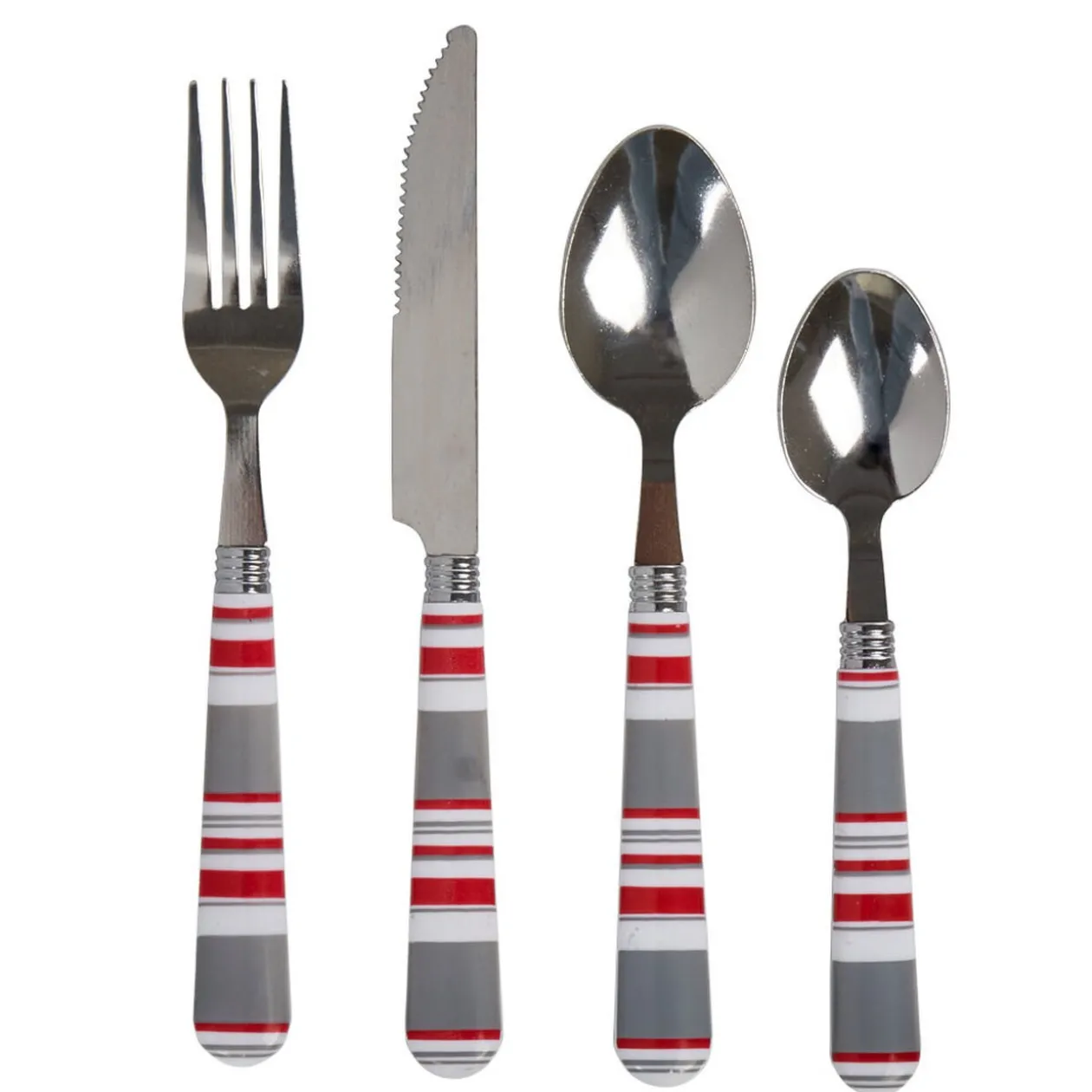 Ajoutez un peu de couleurs à votre table avec cette ménagère de 24 pièces avec 4 fourchettes, 4 couteaux ronds, 4 grandes cuillères et 4 petites cuillères à rayures bayadère.