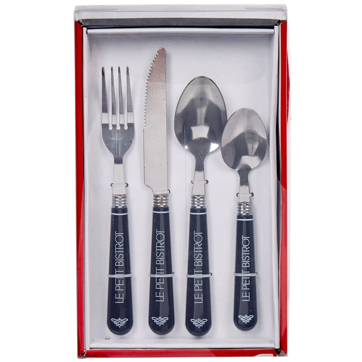 Transformez votre intérieur en bistrot le temps d’un repas avec cette ménagère de 24 pièces avec 4 fourchettes, 4 couteaux ronds, 4 grandes cuillères et 4 petites cuillères avec inscription « Le petit bistrot ».
