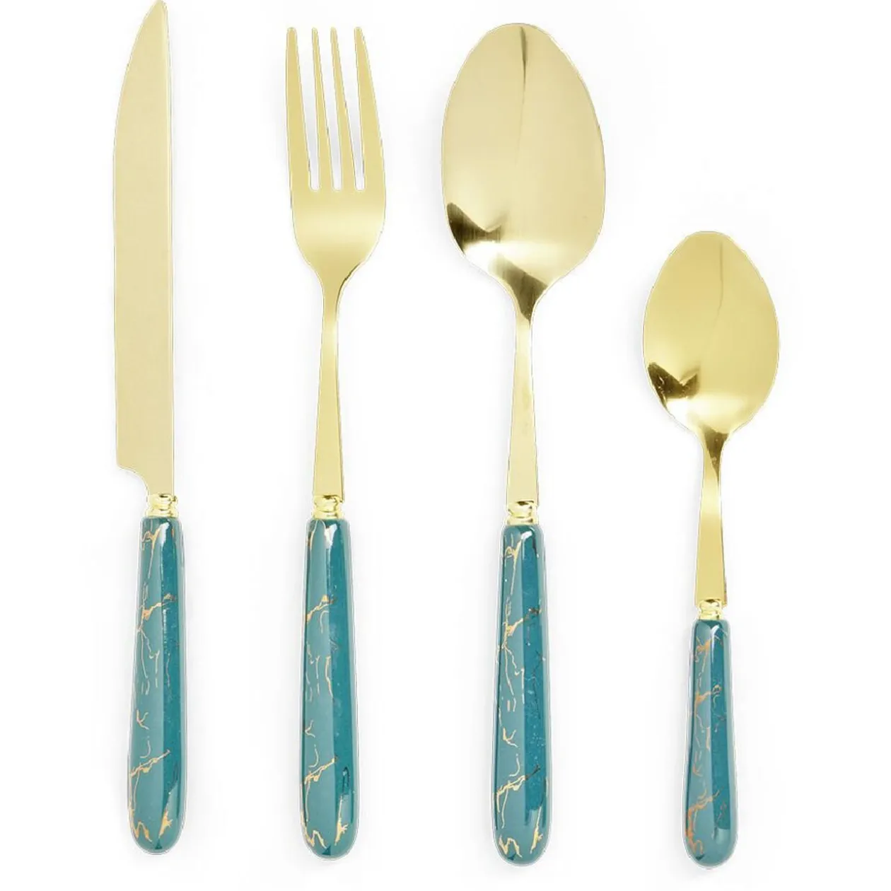 Apportez une touche chic à votre dressage de table avec cette ménagère composée 16 couverts dorés avec manche effet marbre noir ou vert (4 fourchettes, 4 couteaux, 4 cuillères à soupe, 4 cuillères à café).