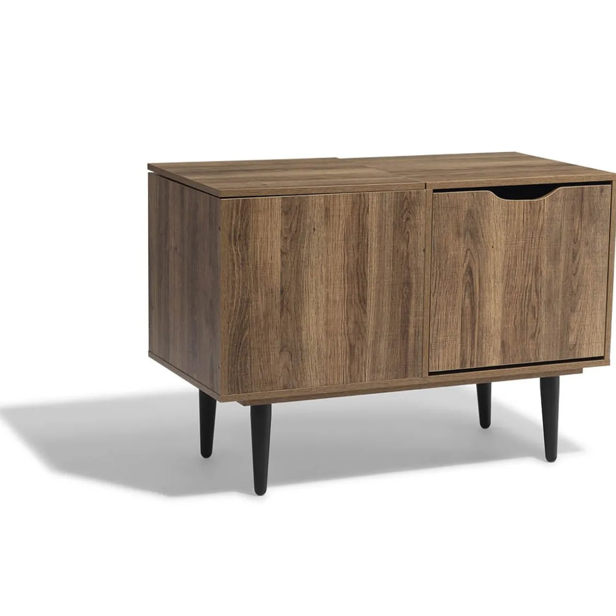 Pour tous les amoureux de styles rétro et de designs tranchés, le meuble à chaussure Fargo a quelque chose de précieux et d’unique à vous offrir ! Sa structure en panneau de particule comprend un tiroir à plusieurs compartiments ainsi qu’un grand coffre pour ranger vos chaussures. Avec tous ces rangements, vous avez de quoi stocker jusqu’à huit paires différentes ! Le meuble à chaussures Fargo tient sur des pieds métalliques de couleur noire pour ce soupçon d’assurance et de modernité qui plaît à tous, mais son design général est beaucoup plus proche de l’ambiance années 50, avec sa couleur de bois assombrie et les lignes carrées et précises de son design. Il est conseillé de coupler ce meuble avec d’autres merveilles de la gamme, comme la table basse ou le bureau Fargo.