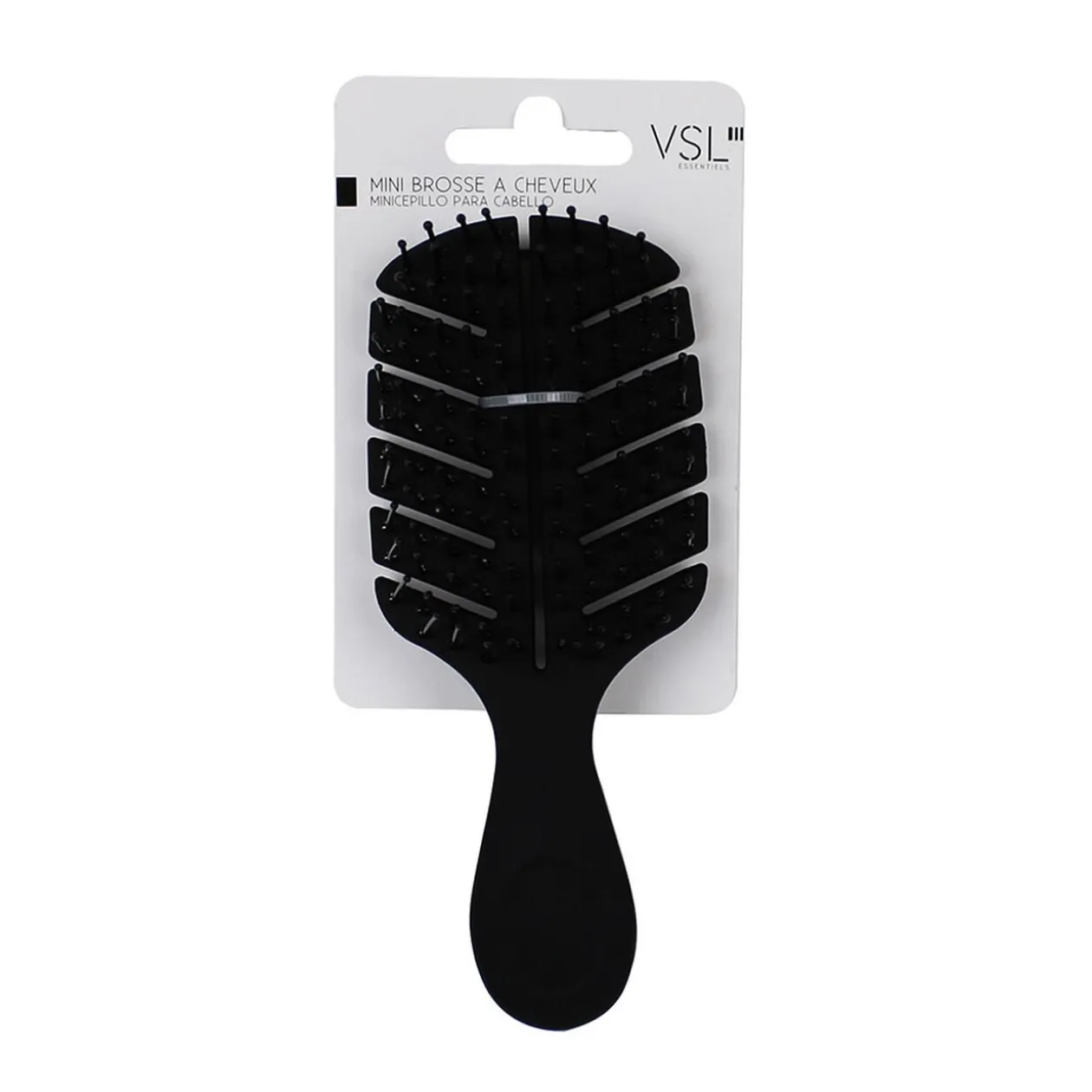 Mini brosse à cheveux en plastique noir. Peu encombrante, vous pourrez facilement la ranger dans votre sac.