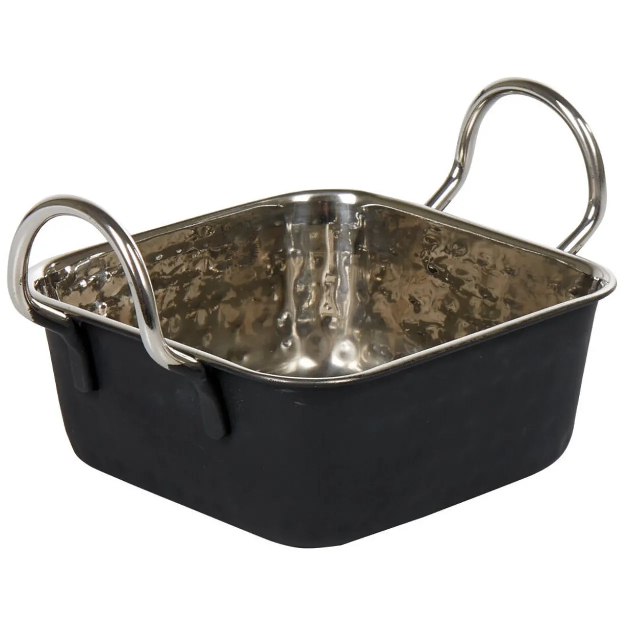 Mini plat à four carré avec poignées de couleur noir ou cuivre à l’extérieur et argenté à l’intérieur.
