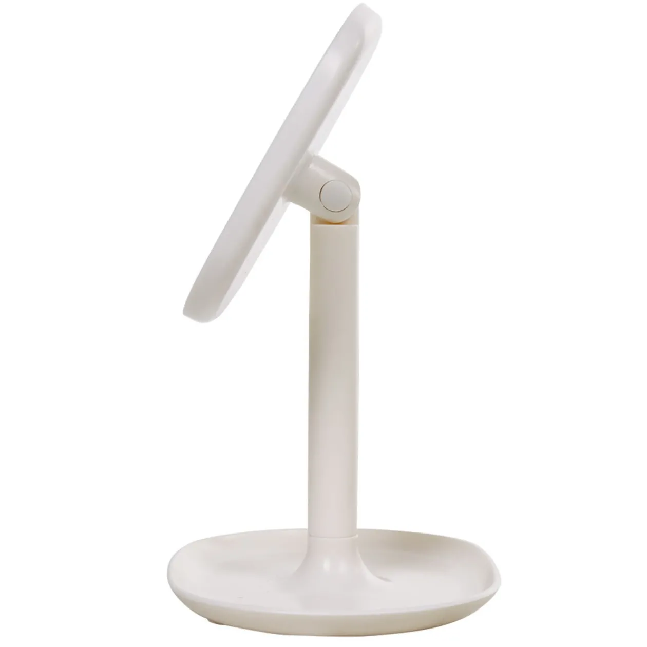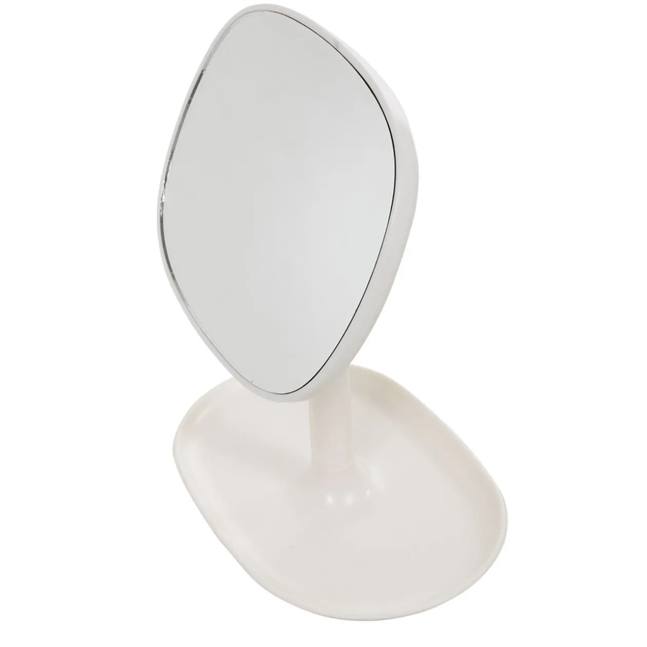 Miroir POP inclinable de couleur blanche sur pieds pouvant faire office de repose bijoux ou accessoires.