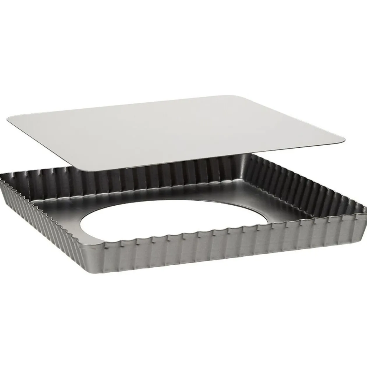 Moule à pâtisserie carré avec fond amovible et revêtement anti-adhérent pour un démoulage parfait sans miettes ni effritements.