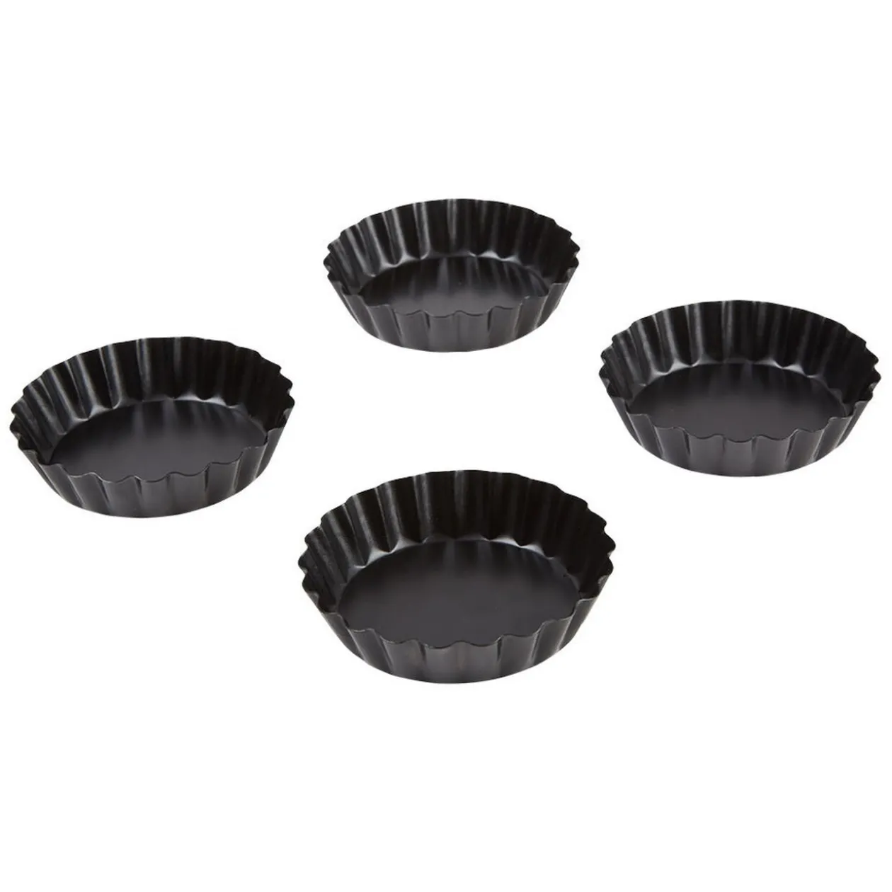 Lot de 4 moules ronds à tartelettes à fonds amovibles ainsi le démoulage de votre pâtisserie sera parfait sans miettes ni effritements.