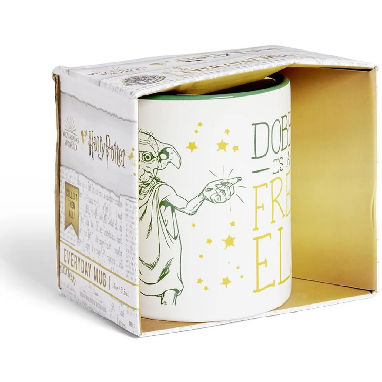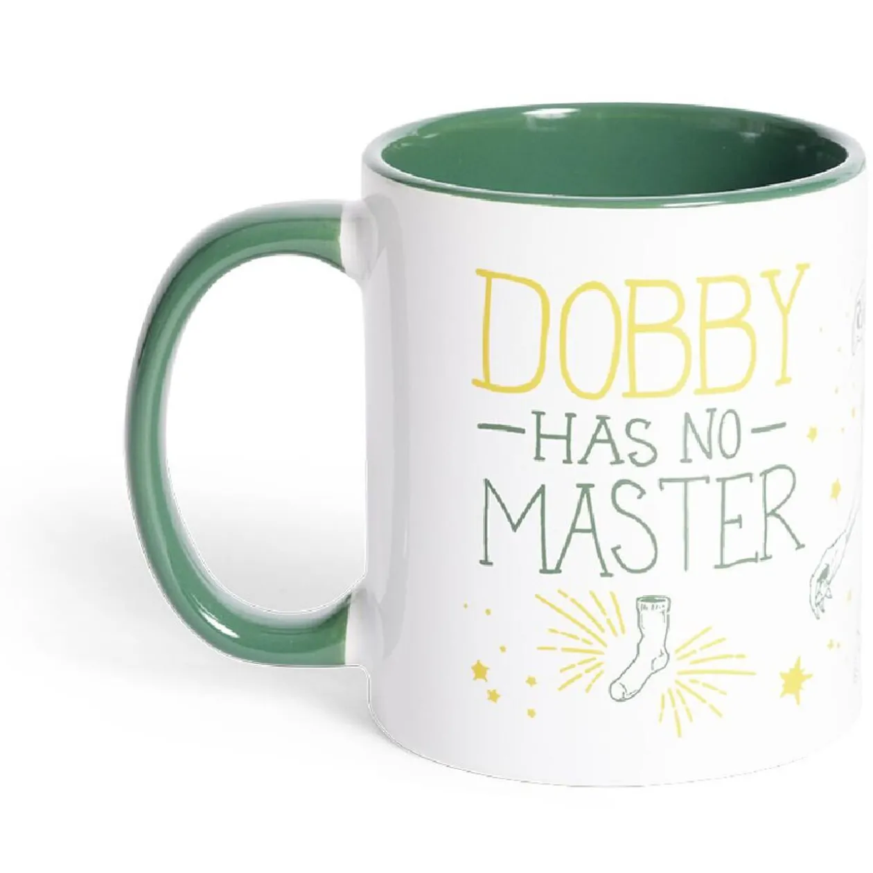 Soyez enchanté par ce mug Harry Potter mettant en avant Dobby orné d’étoiles et d’inscriptions « Dobby has no master » et « Dobby is a free elf ».