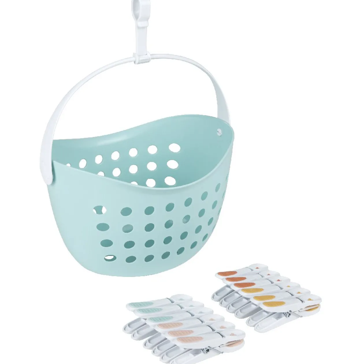 Adoptez ce panier bleu super pratique qui vous permet d’avoir vos pinces à linge toujours à portée de main. Accrochez le panier au fil à linge et faîtes le glisser au fil de l’étendage. 12 pinces à linge incluses.