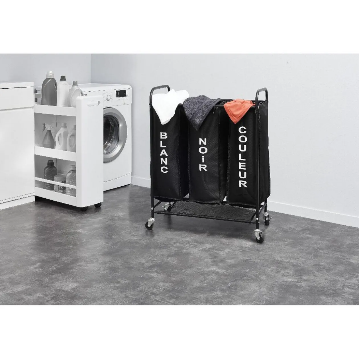 Pour trier votre linge sans vous fatiguer, ce chariot à roulettes contient 3 panières amovibles. Une panière pour le noir, une pour le blanc et une pour les couleurs. C’est indiqué dessus et vous n’avez plus qu’à jeter votre linge dedans. Déplacez le chariot aisément grâce aux freins intégrès.