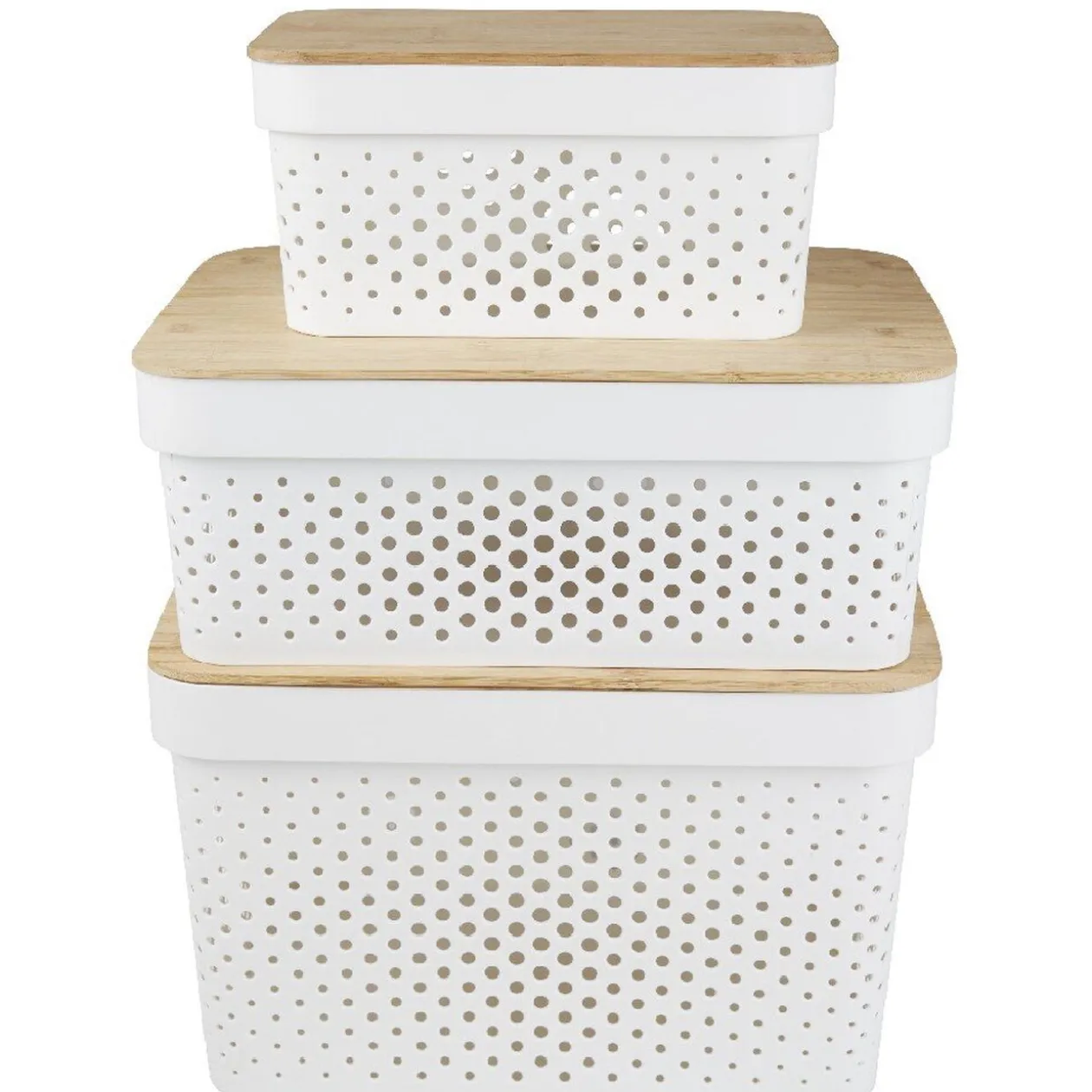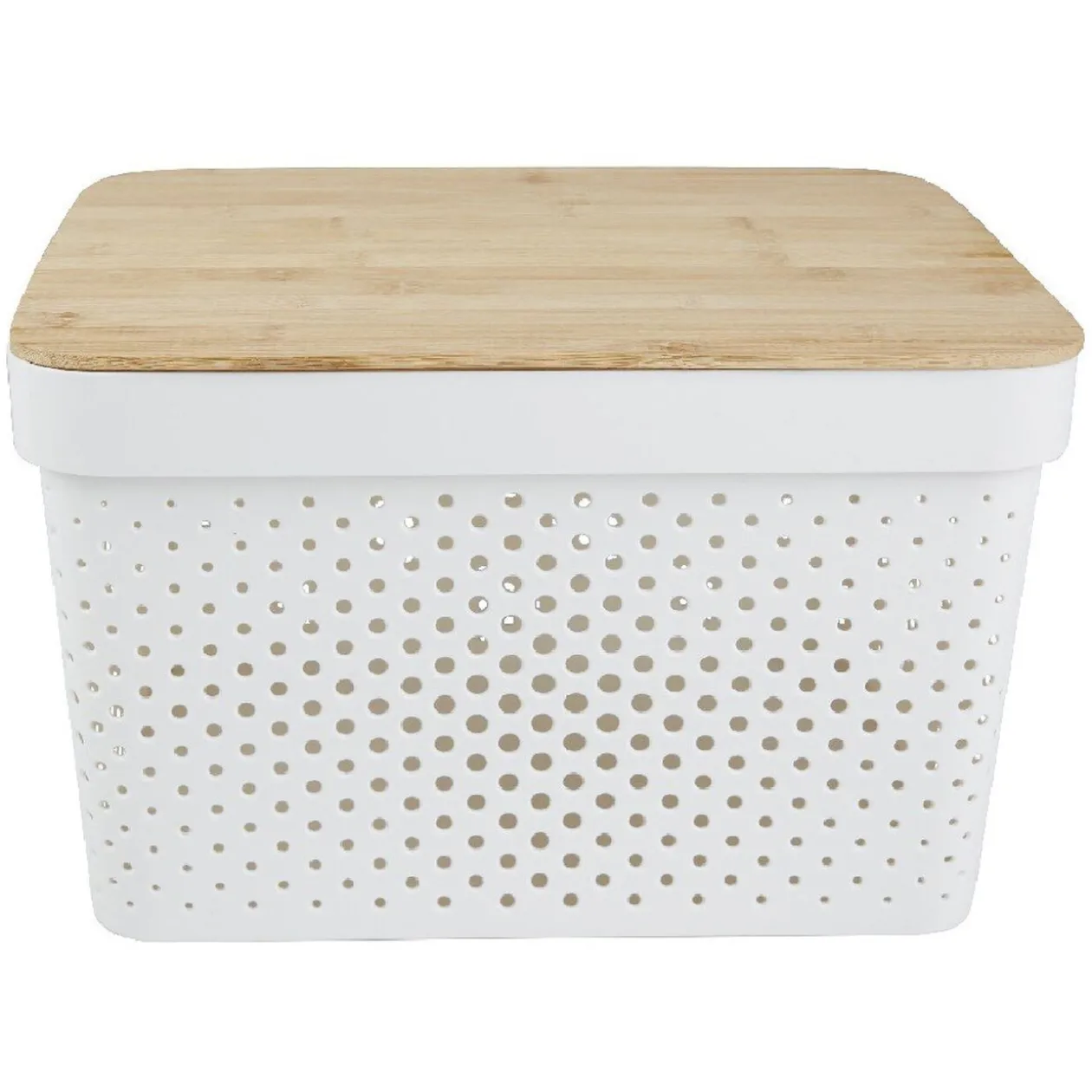 Jolie panière de rangement en plastique blanc ajouré avec couvercle en bambou. Superposable et ultra déco, cette jolie boîte de rangement trouvera sa place dans toutes les pièces de votre intérieur que ce soit dans la chambre, la cuisine ou la salle de bain…