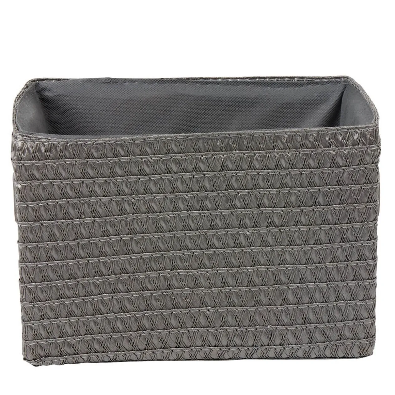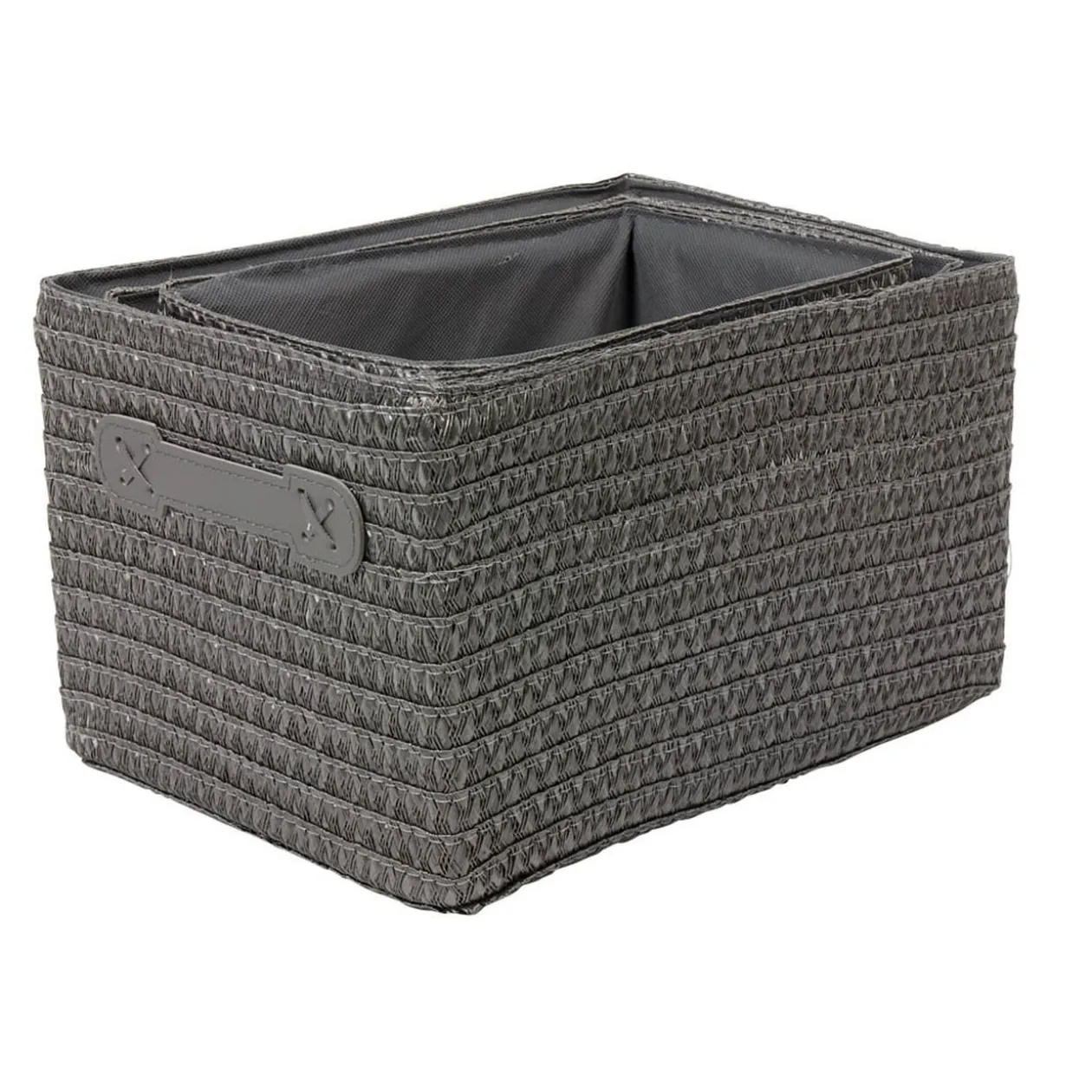 Set de 3 panières grises en plastique effet tressé et décorées de poignées.