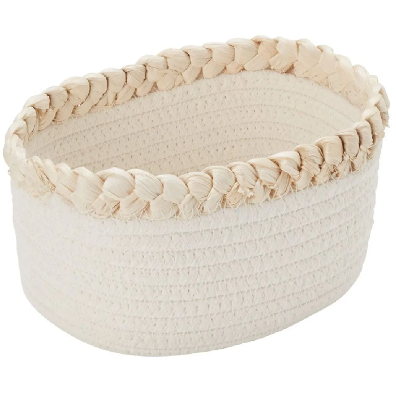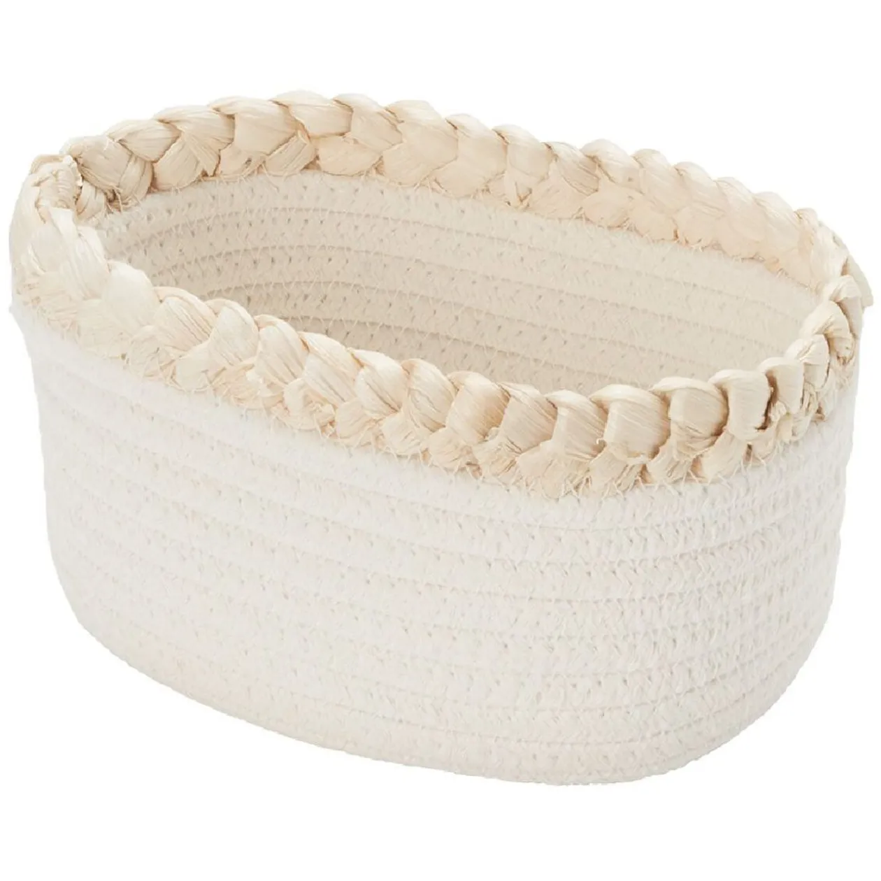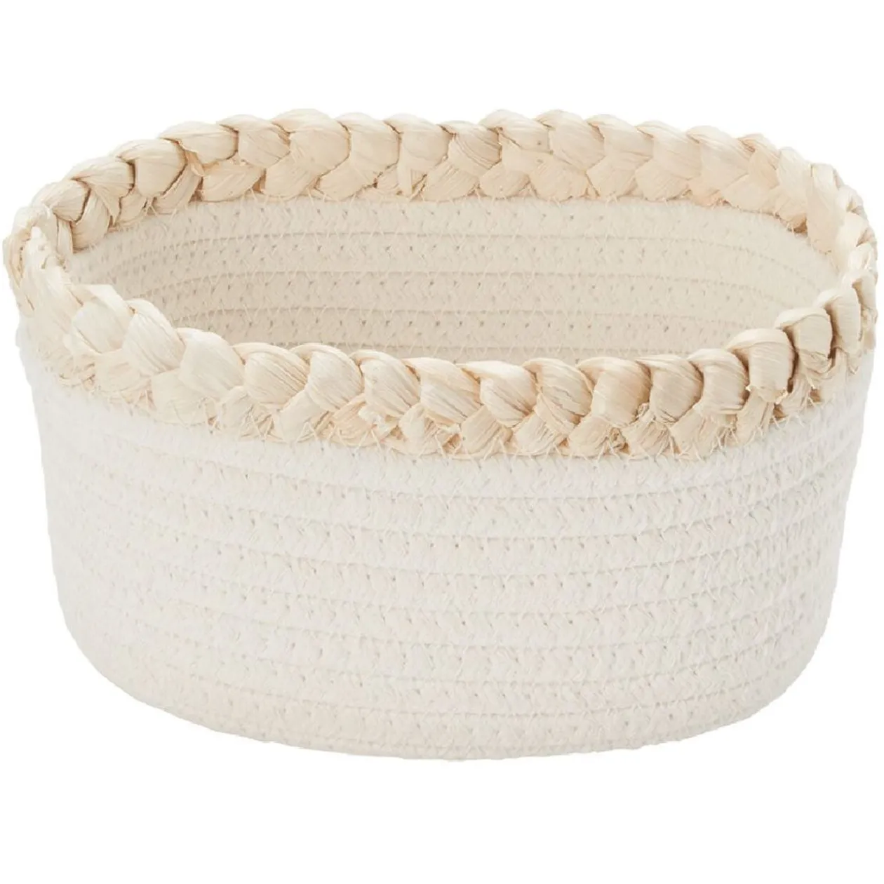 Panière rectangulaire blanche et naturelle en fibre tressée, parfaite pour organiservos affaires sur les étagères dans un style épuré et tendance.