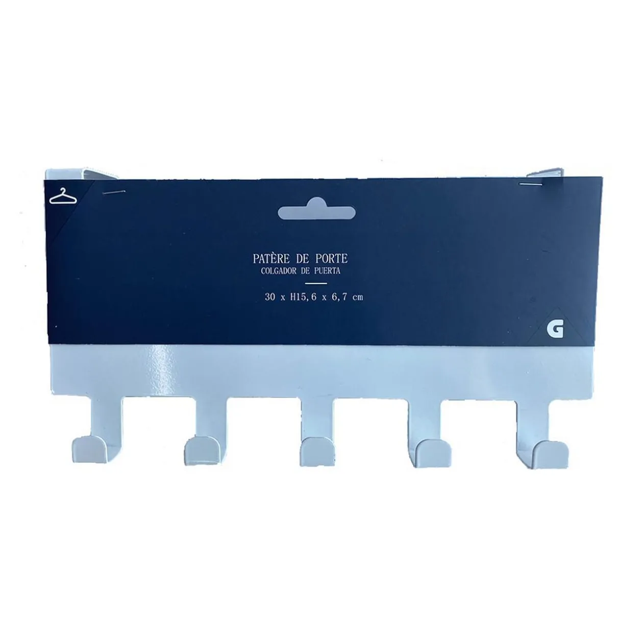 5 crochets. Pratique, elle se fixe sur la porte. Fixation sans vis.