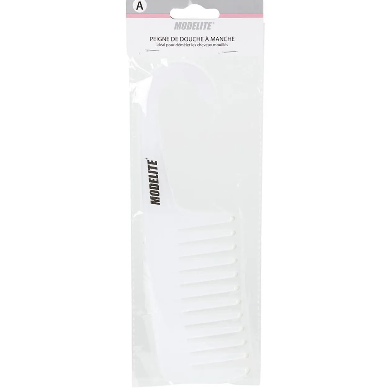 Peigne de douche avec crochet de suspension intégré au manche.