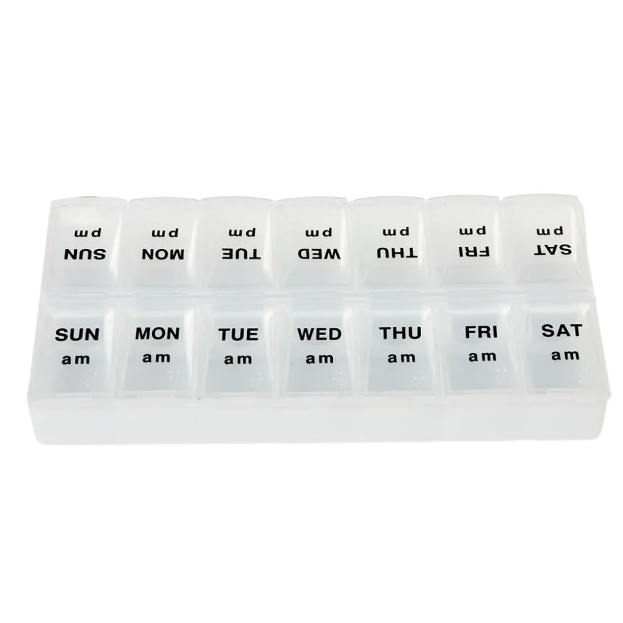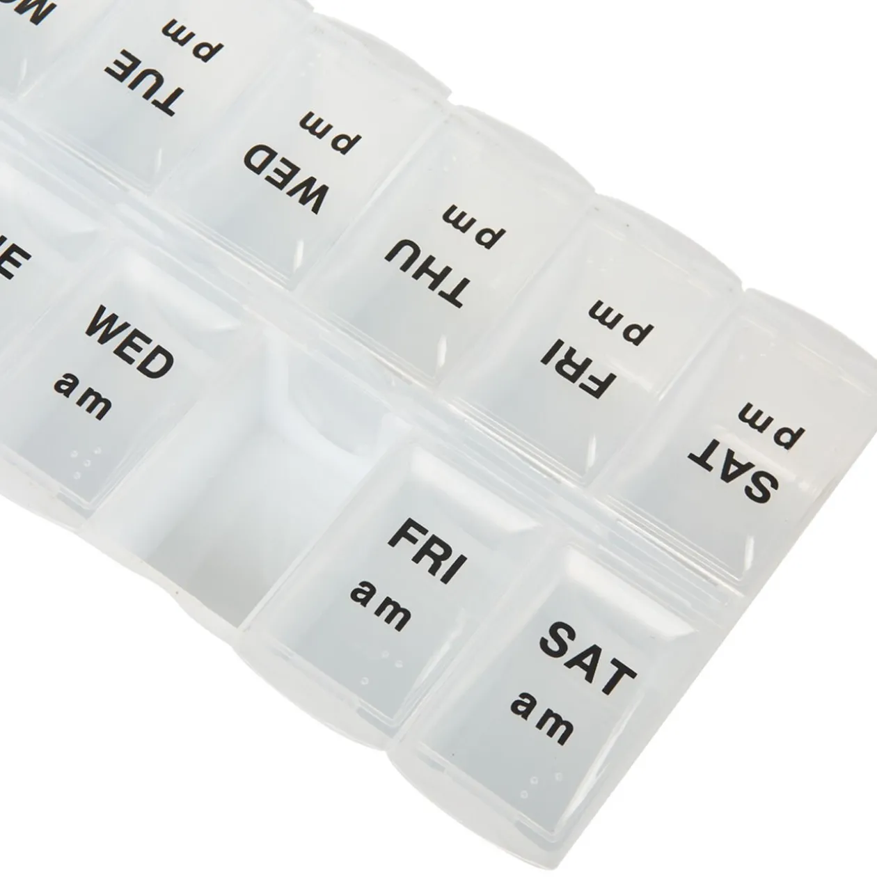 Idéal pour ne plus oublier vos médicaments ! Pilulier rectangulaire de 14 compartiments avec les jours de la semaine inscrits.