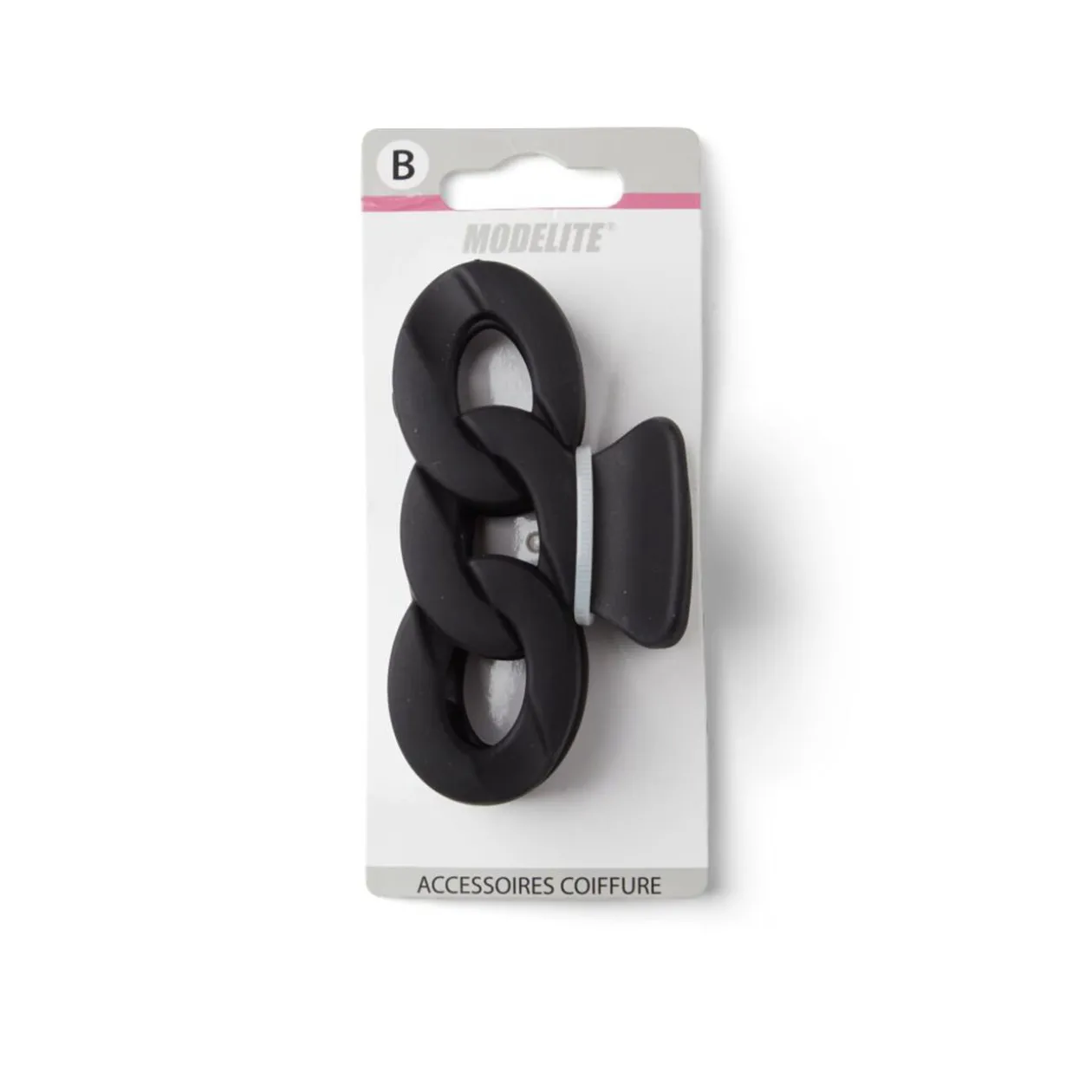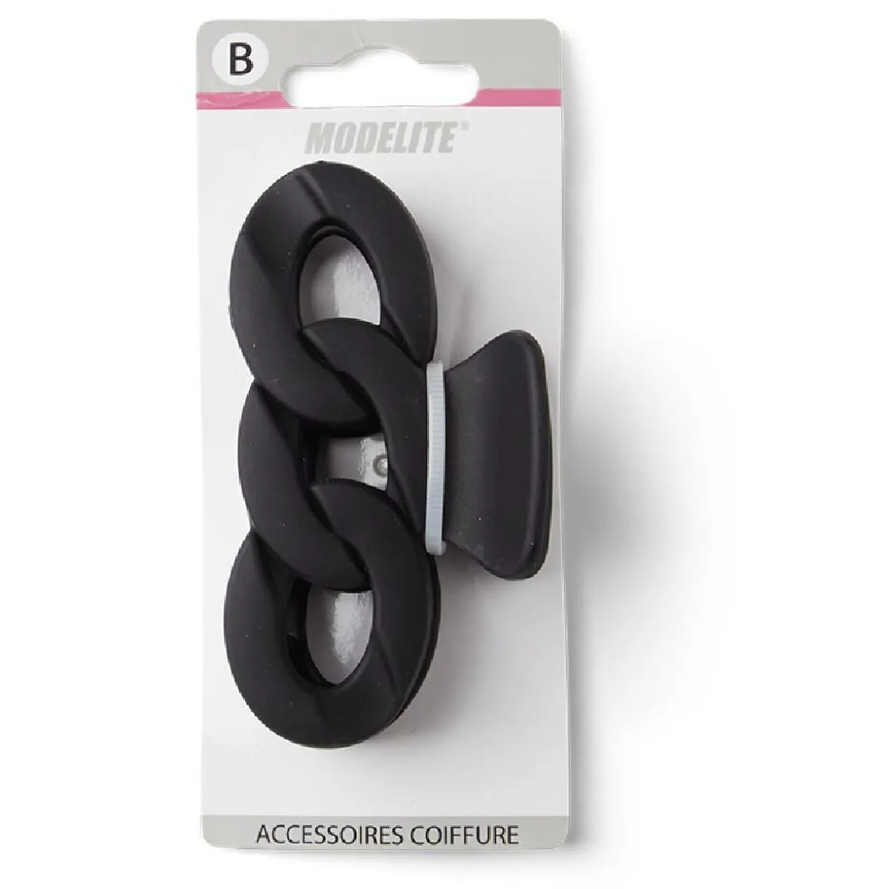 Cette pince à cheveux effet chaîne, en plastique noir mat et mesurant 8 cm de longueur, offre une prise fiable tout en ajoutant une touche glamour à toute coiffure.
